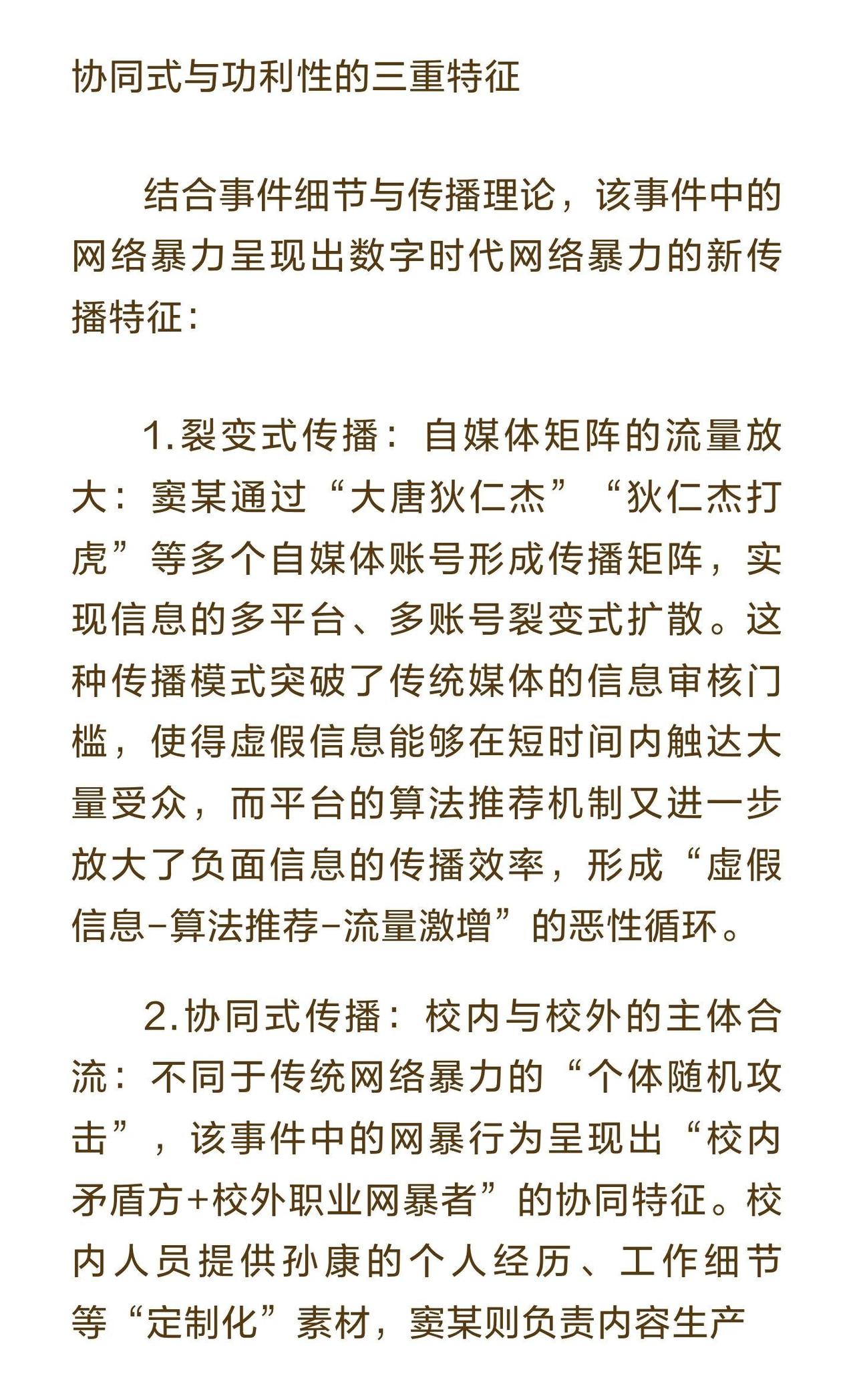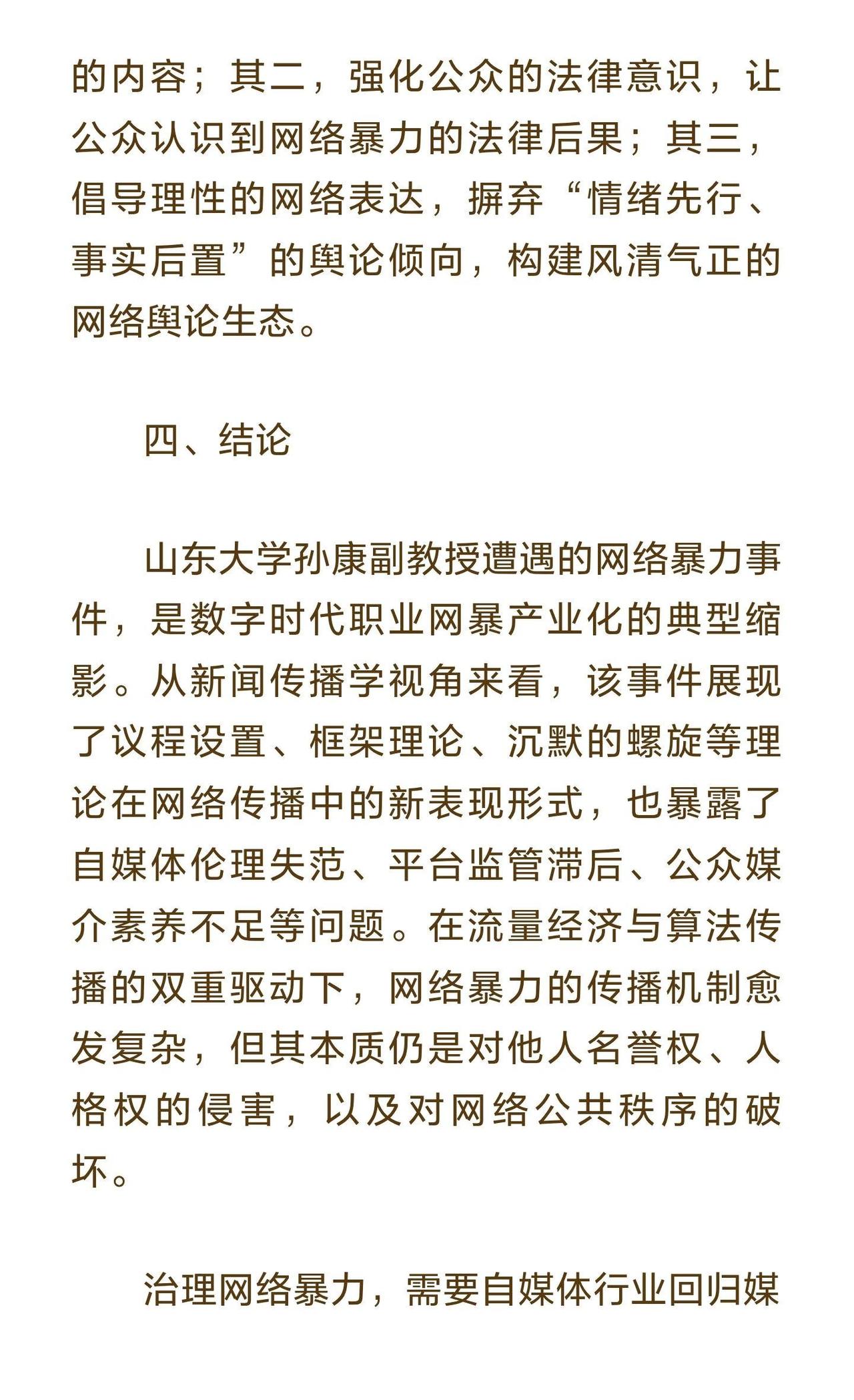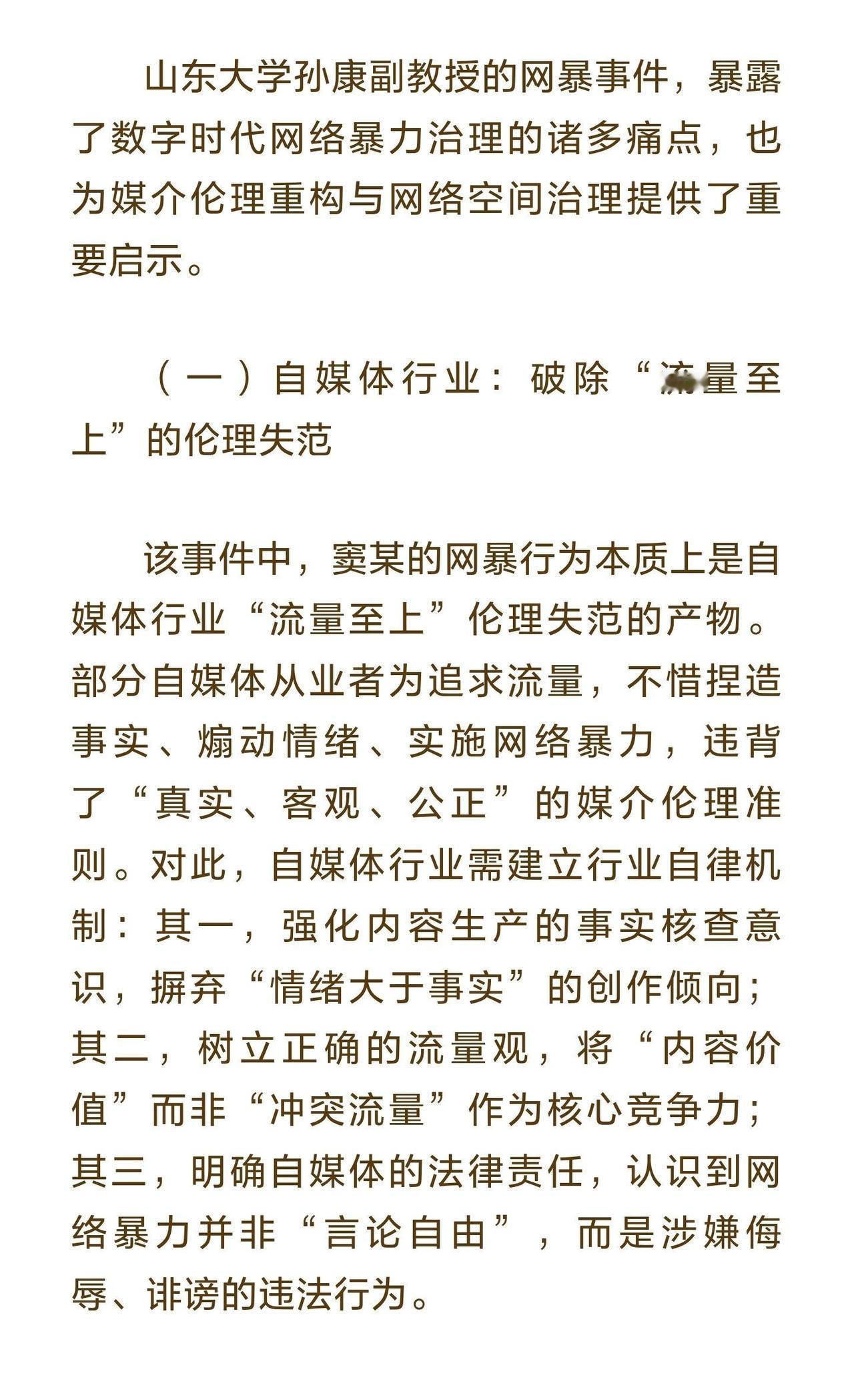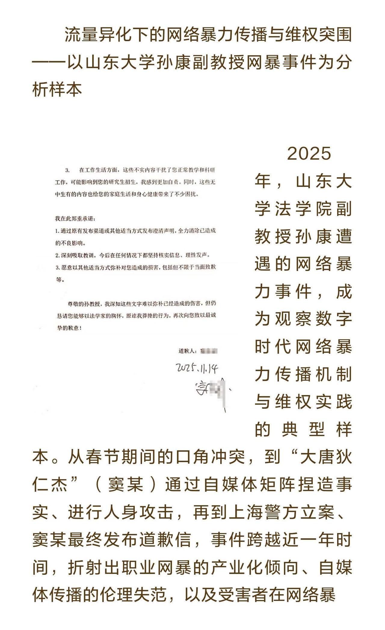 流量异化下的网络暴力传播与维权突围——以 山东大学孙康副教授遭遇职业网暴,窦某通过自媒体捏造虚假信息,引发网络暴力。警方介入后,窦某道歉,事件暂告一段落。事件揭示网络暴力的产业化、自媒体伦理失范及受害者维权困境,呼吁多方合力治理。