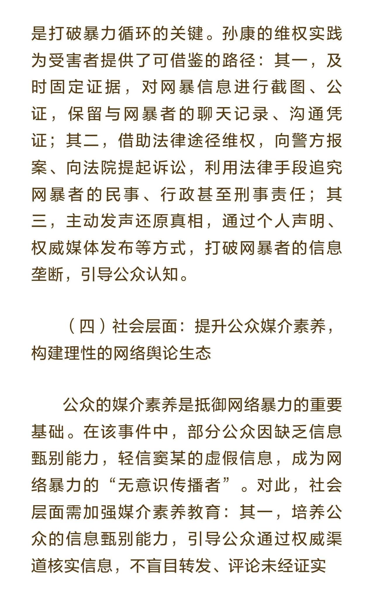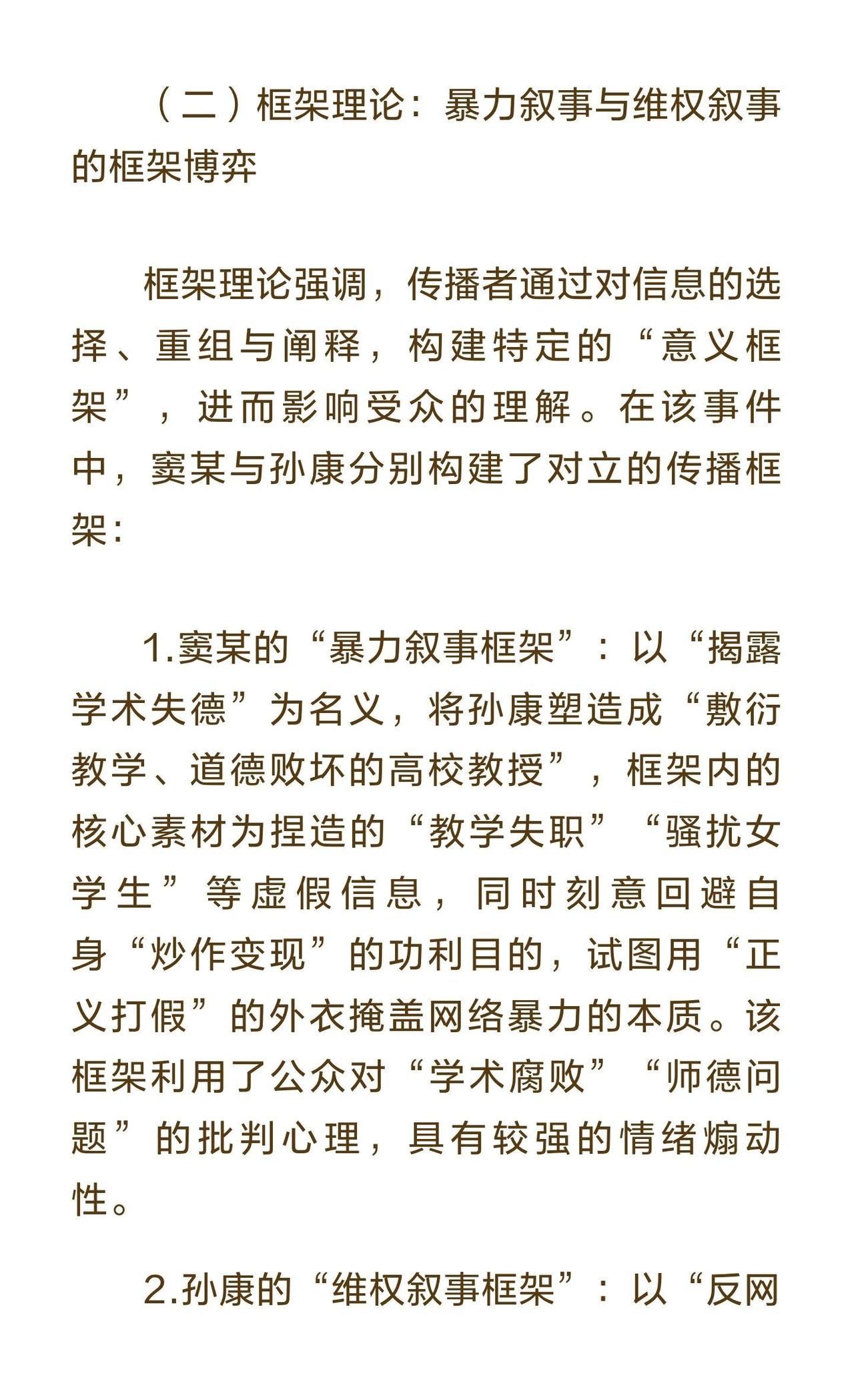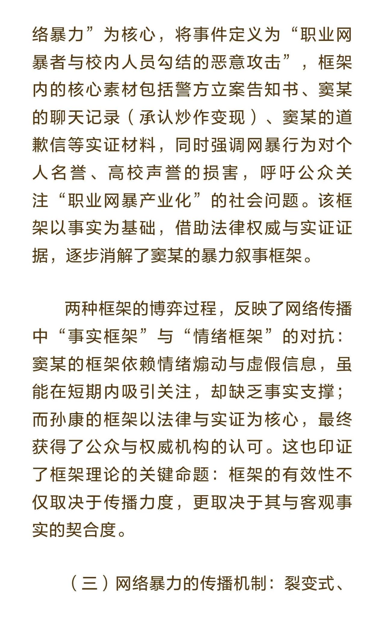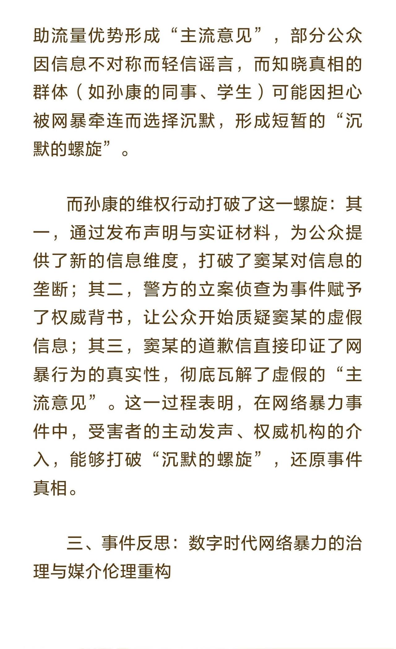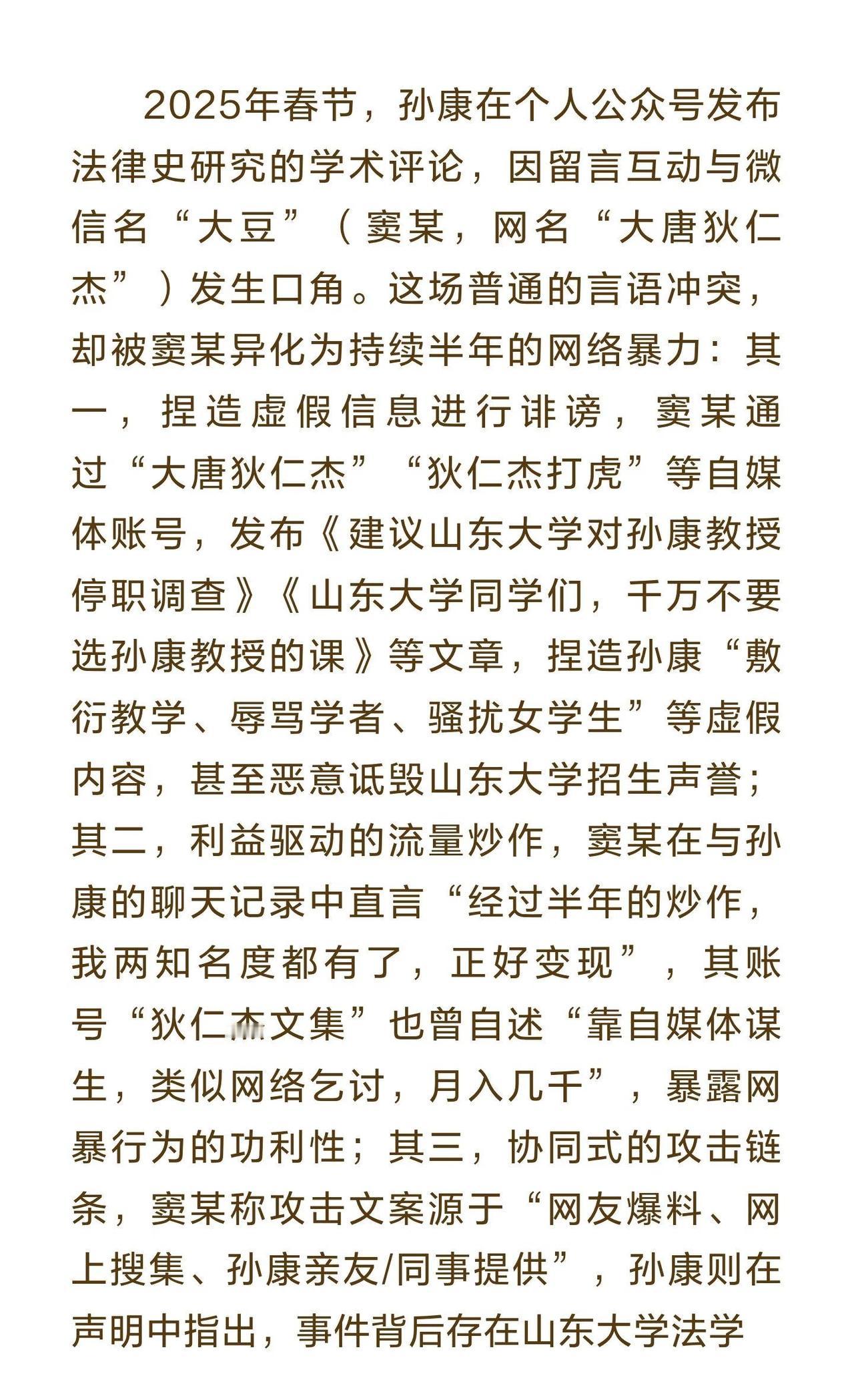 流量异化下的网络暴力传播与维权突围——以 山东大学孙康副教授遭遇职业网暴,窦某通过自媒体捏造虚假信息,引发网络暴力。警方介入后,窦某道歉,事件暂告一段落。事件揭示网络暴力的产业化、自媒体伦理失范及受害者维权困境,呼吁多方合力治理。