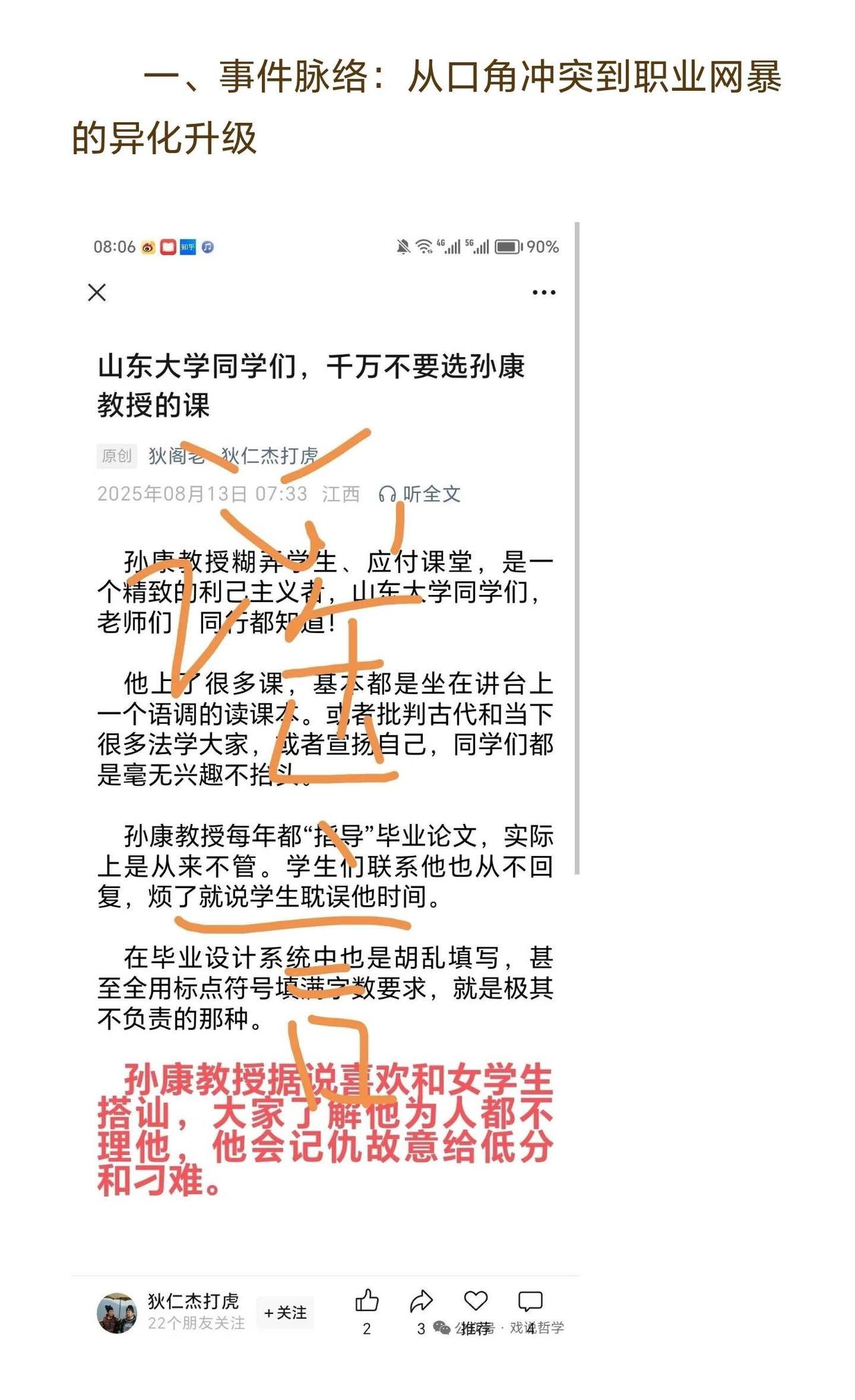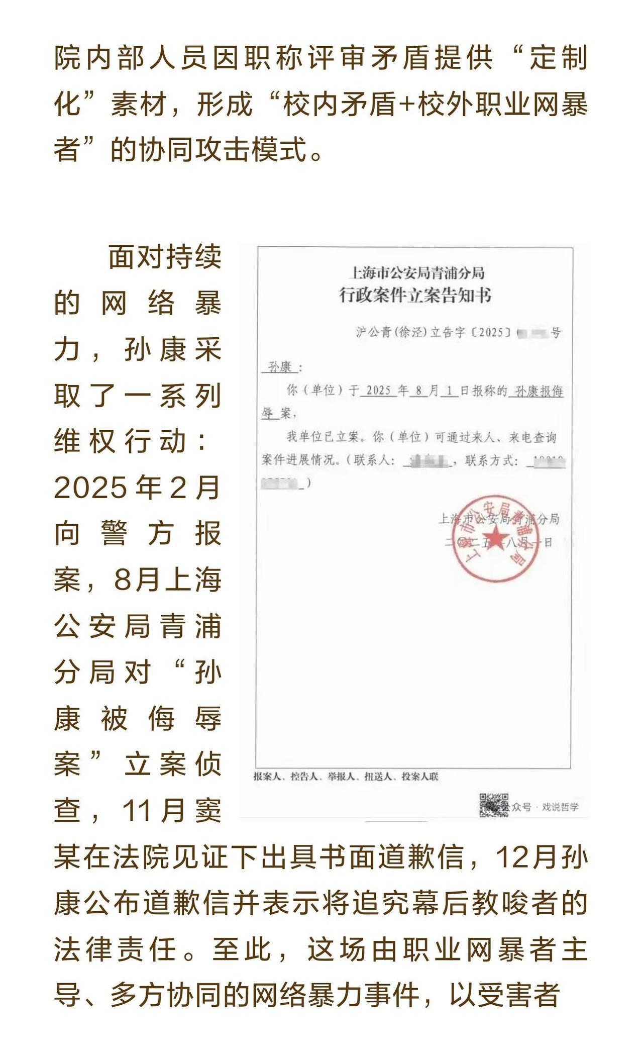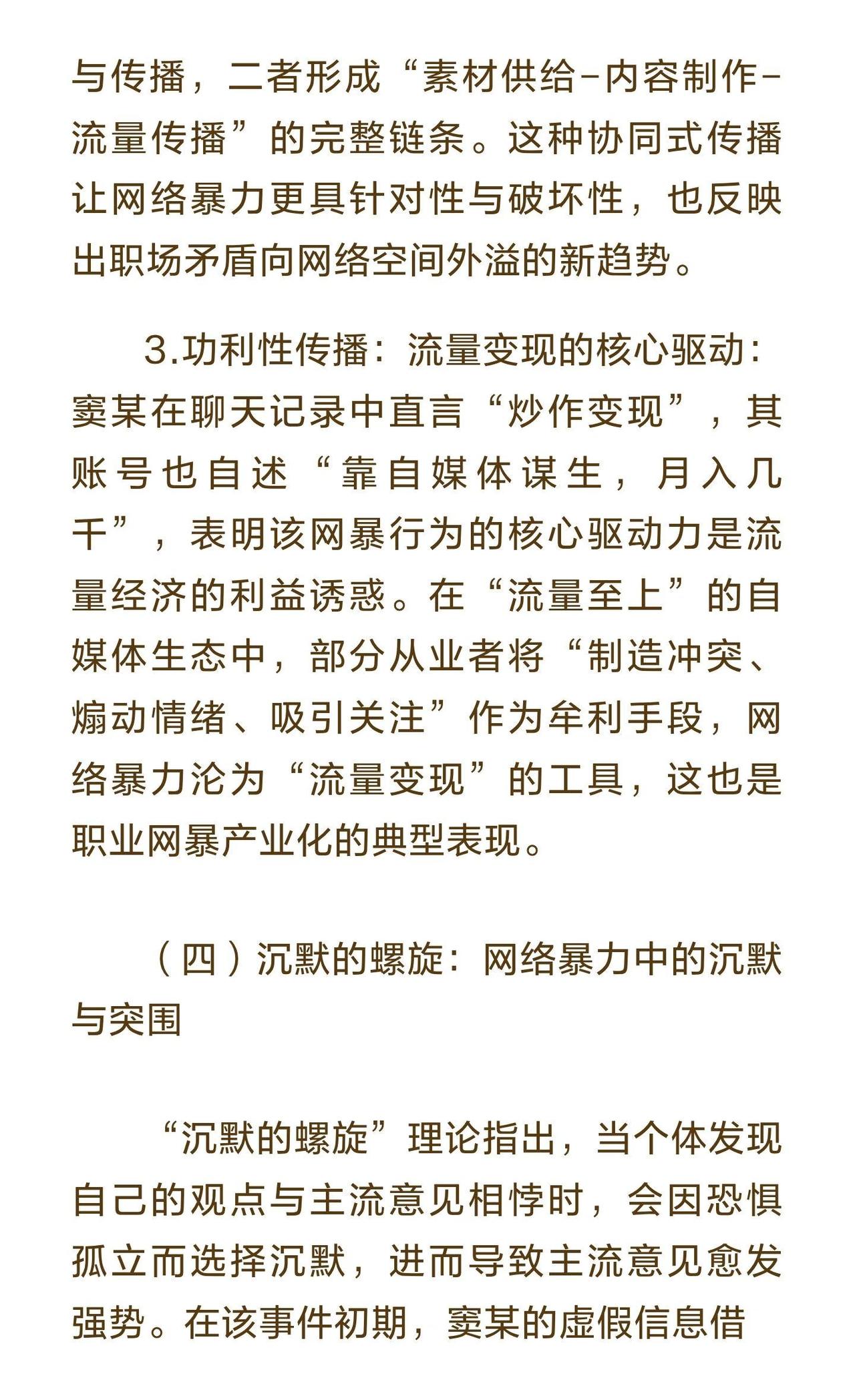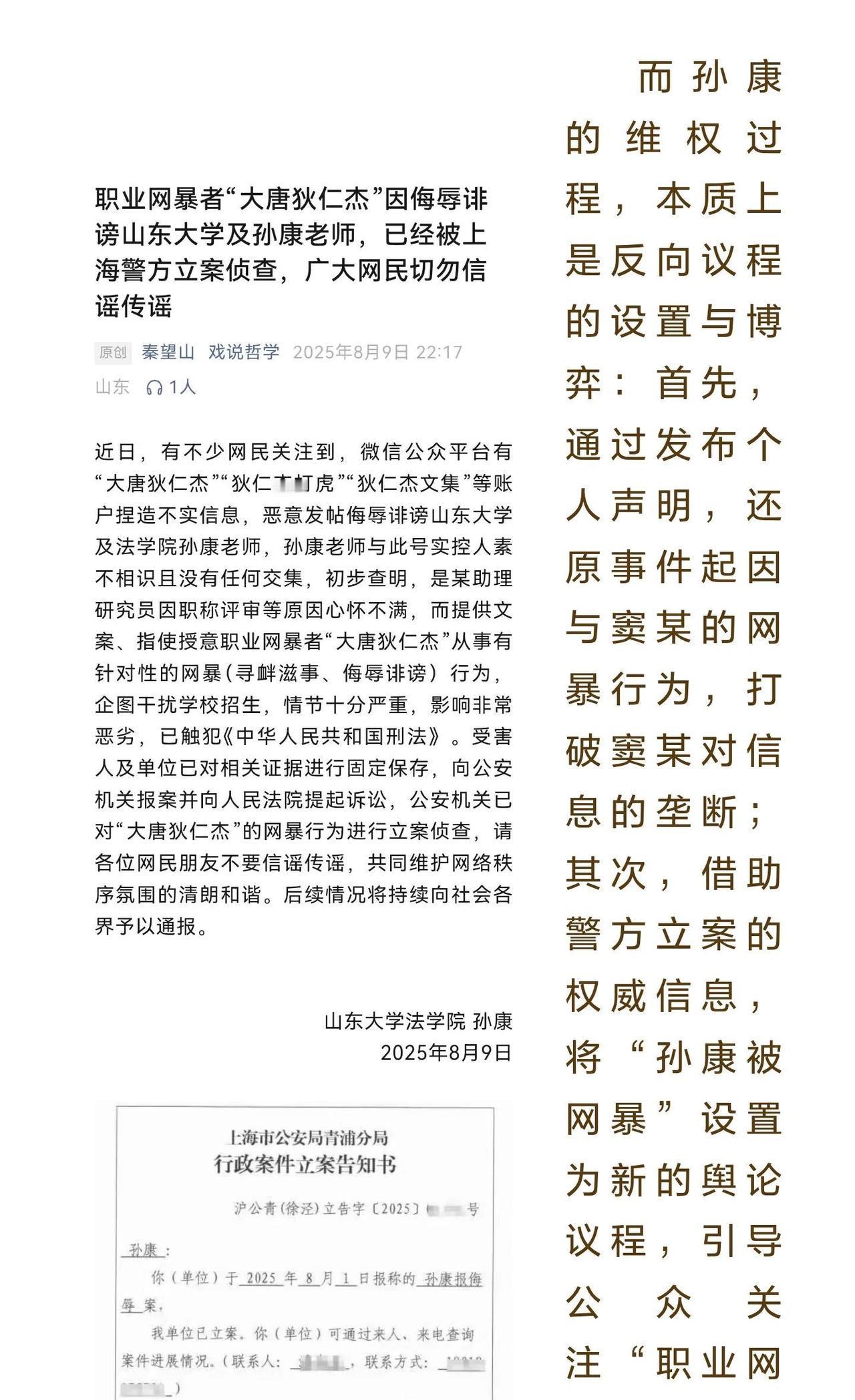 流量异化下的网络暴力传播与维权突围——以 山东大学孙康副教授遭遇职业网暴,窦某通过自媒体捏造虚假信息,引发网络暴力。警方介入后,窦某道歉,事件暂告一段落。事件揭示网络暴力的产业化、自媒体伦理失范及受害者维权困境,呼吁多方合力治理。