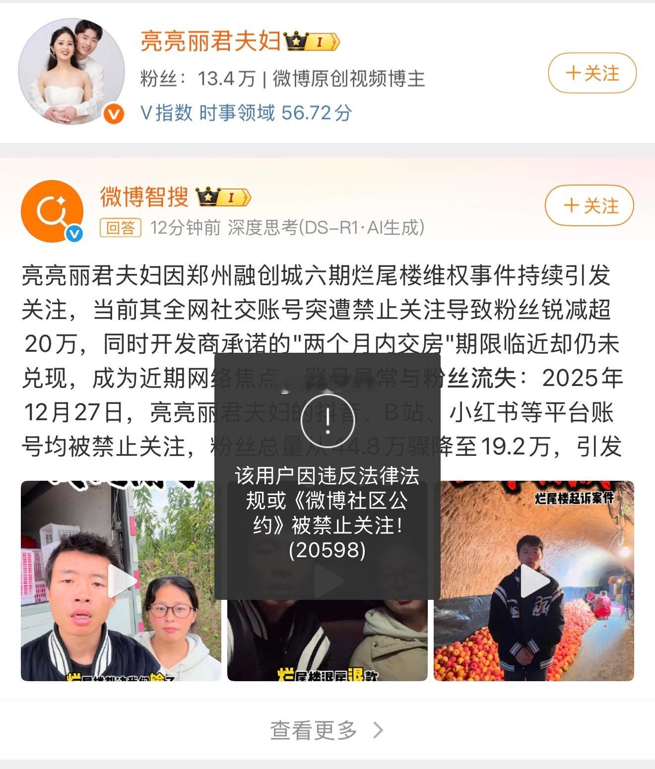 博主“亮亮丽君夫妇”全网账号(包括微博,抖音、b站、小红书)被禁止关注,粉丝从44.8万降到19.2万。