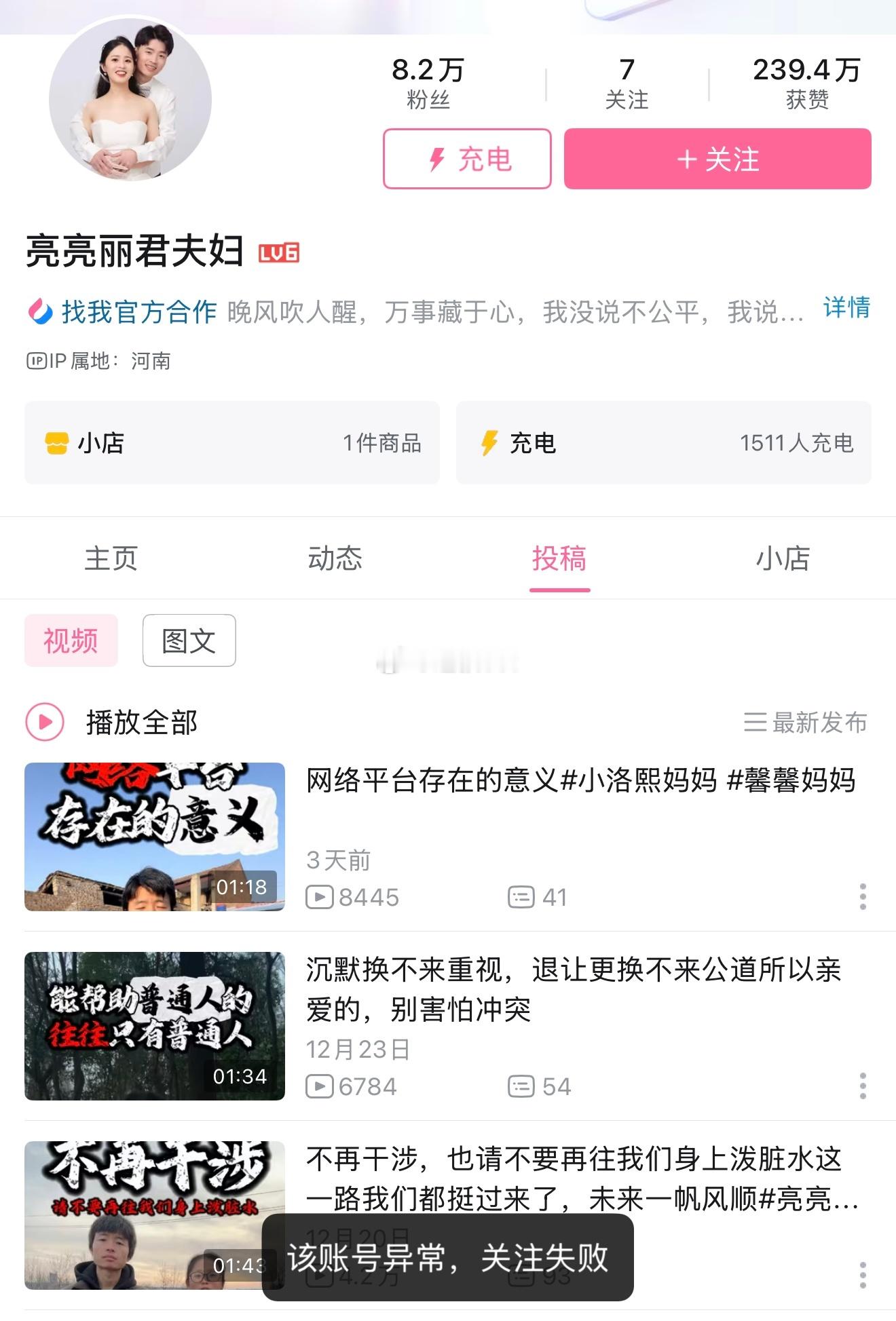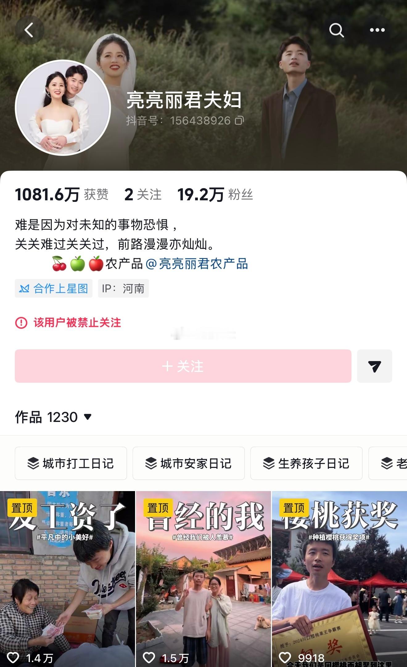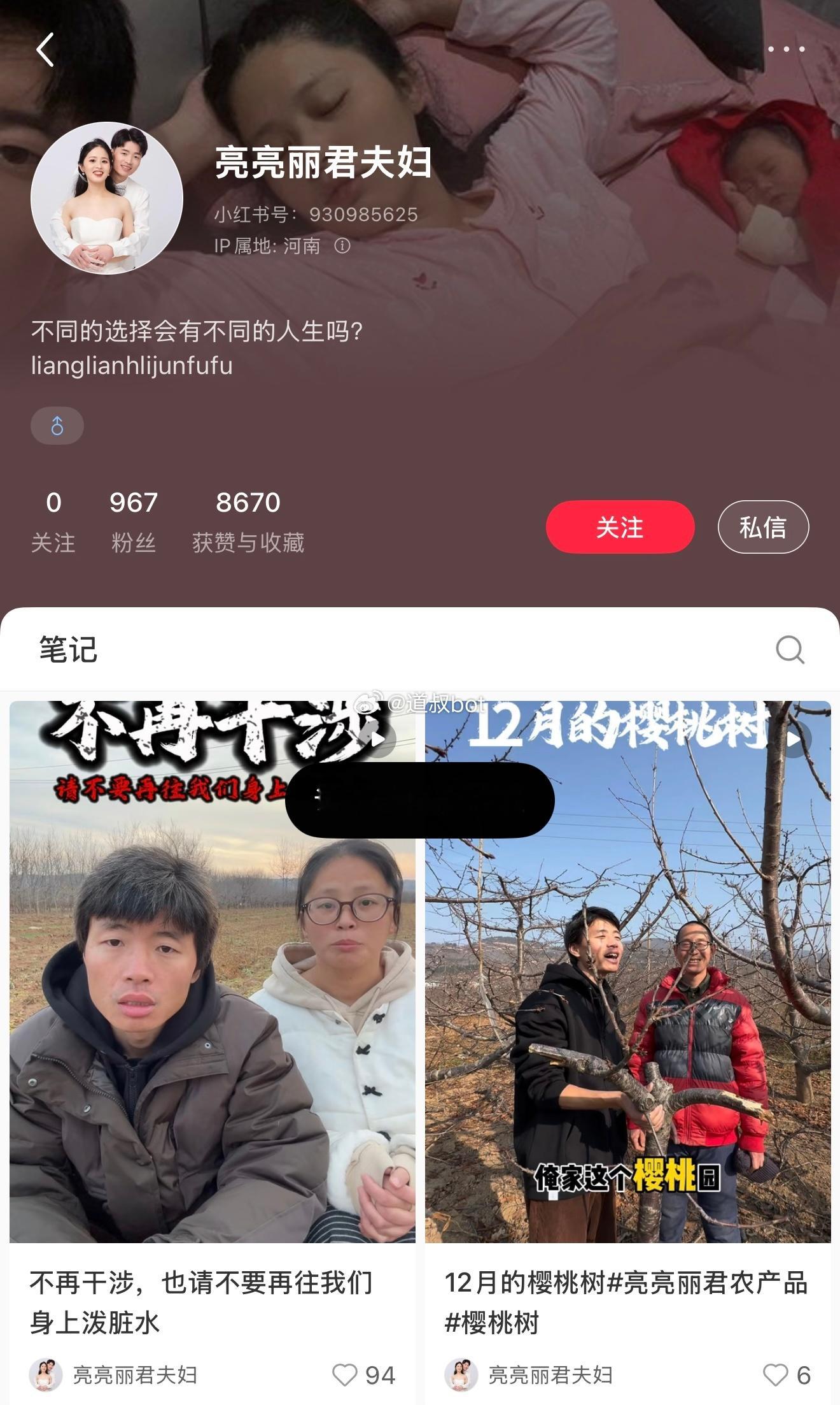 博主“亮亮丽君夫妇”全网账号(包括微博,抖音、b站、小红书)被禁止关注,粉丝从4