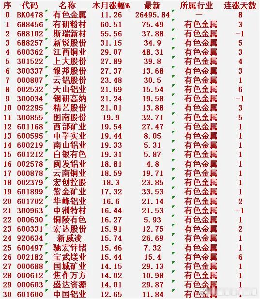 有色金属概念,十二月以来涨幅最多的30名单有研粉材:本月涨幅 +60.51%,最新价 75.49 元,连涨3天斯瑞新材:本月涨幅 +55.56%,最新价 37.88 元,连跌1天(短期回调)新锐股份:本月涨幅 +31.15%,最新价 34.90 元,连涨5天江西铜业:本月涨幅 +29.07%,最新价 48.31 元,连涨3天上大股份:本月涨幅 +27.89%,最新价 39.80 元,连涨4天银邦股份:本月涨幅 +27.37%,最新价 13.68 元,连涨3天云铝股份:本月涨幅 +23.48%,最新价 30.50 元,连涨1天天山铝业:本月涨幅 +21.69%,最新价 15.54 元,连涨6天钢研高纳:本月涨幅 +21.24%,最新价 19.58 元,连跌1天精艺股份:本月涨幅 +21.01%,最新价 13.88 元,连涨3天