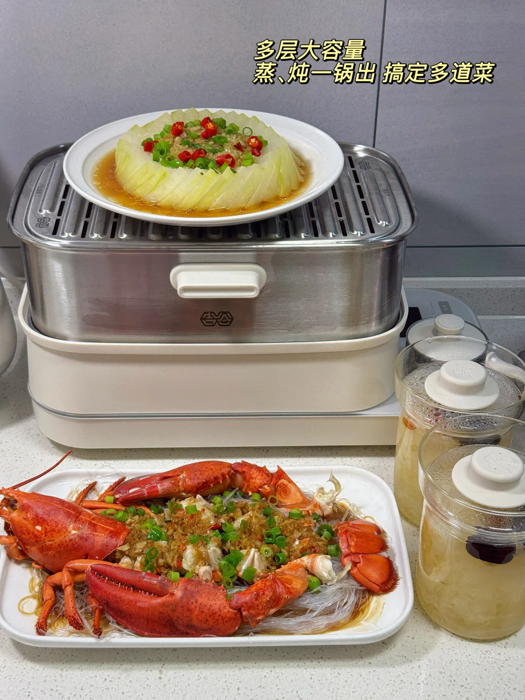 它的聚能猛火蒸能快速穿透食材 锁住每一口食物的鲜嫩,分层的蒸架就算多菜同时蒸也不会串味,容量也是很大 一整条鱼无需切段就能平放,上层蒸海鲜、中层码荤素蒸主食、下层再煲个汤汤水水,多菜同蒸一锅出,省时又省力!