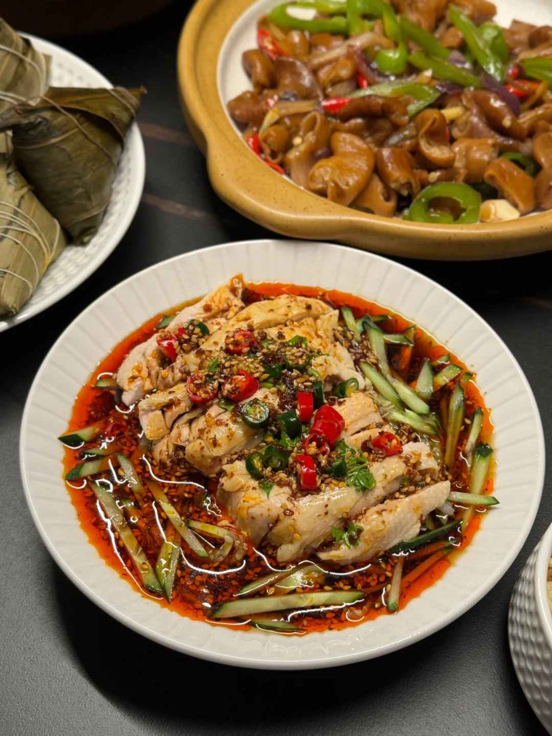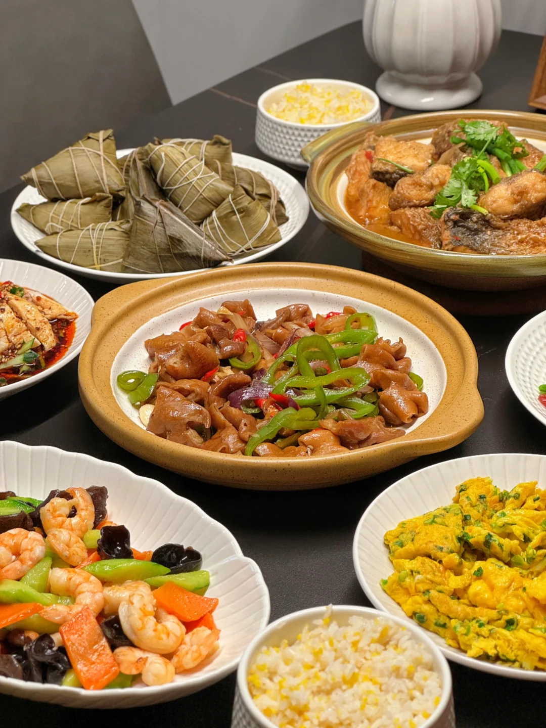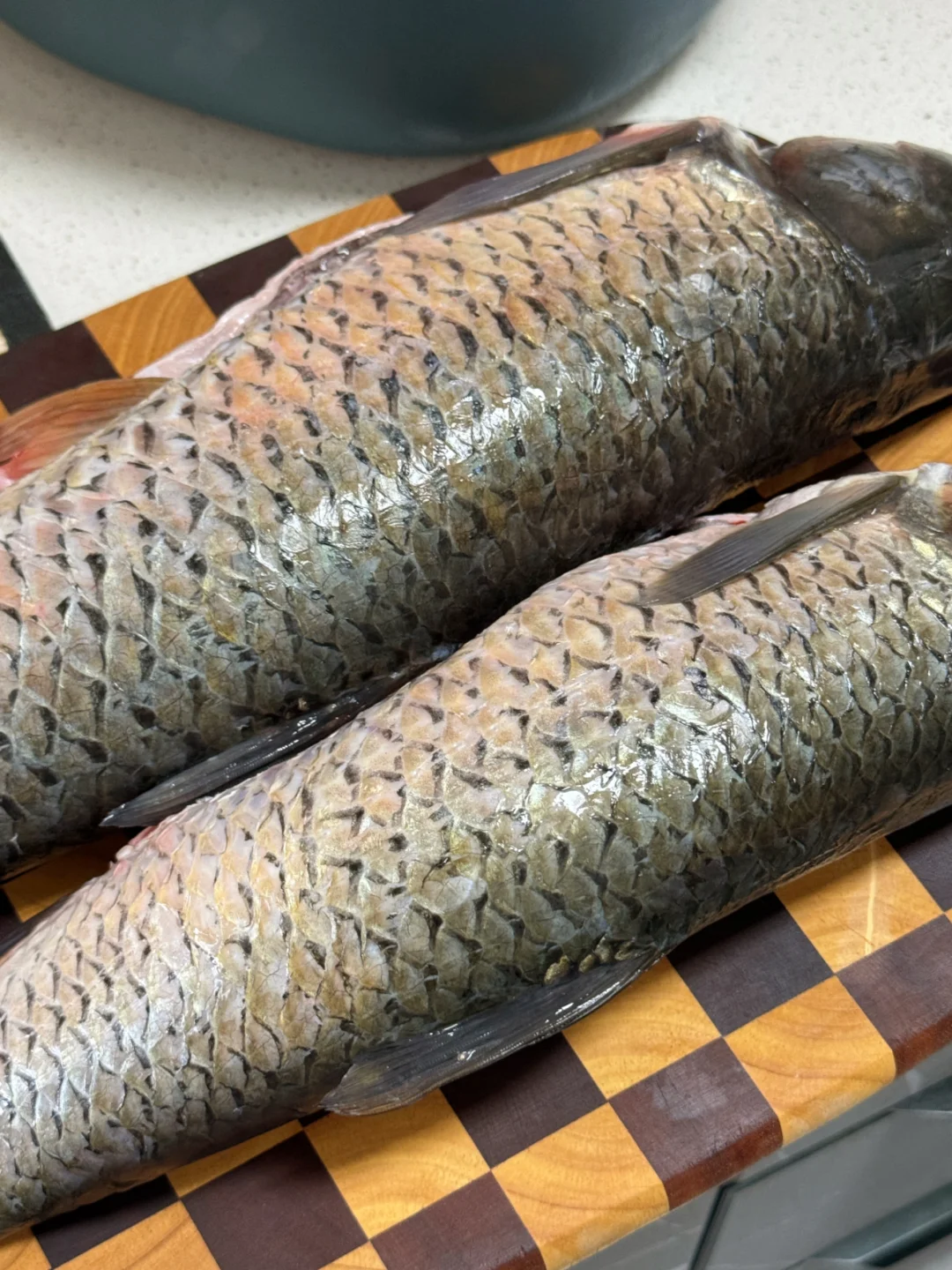 普通食材加用心的烹饪,让普通变得不普通了[彩虹R] 今天室友去钓鱼了,拿回家两条特大条草鱼(比菜板都长[偷笑R])一致同意先炸后烧~ 【菜单】 红烧草鱼 爆炒肥肠 香葱炒鸡蛋 口水鸡 腊肠炒扁豆角 黄瓜木耳炒虾仁 粽子