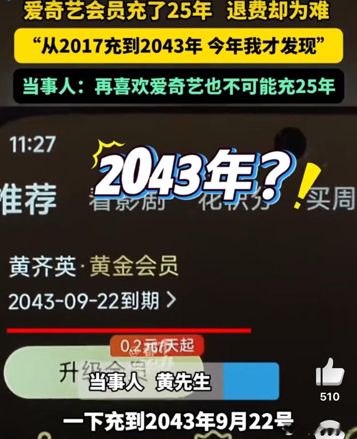 男子爱奇艺会员充了25年遇退费难25年的会员,这是怎么充的呢,这不都是自己主动续费吗?或者是每个月到期了续下一个月的!