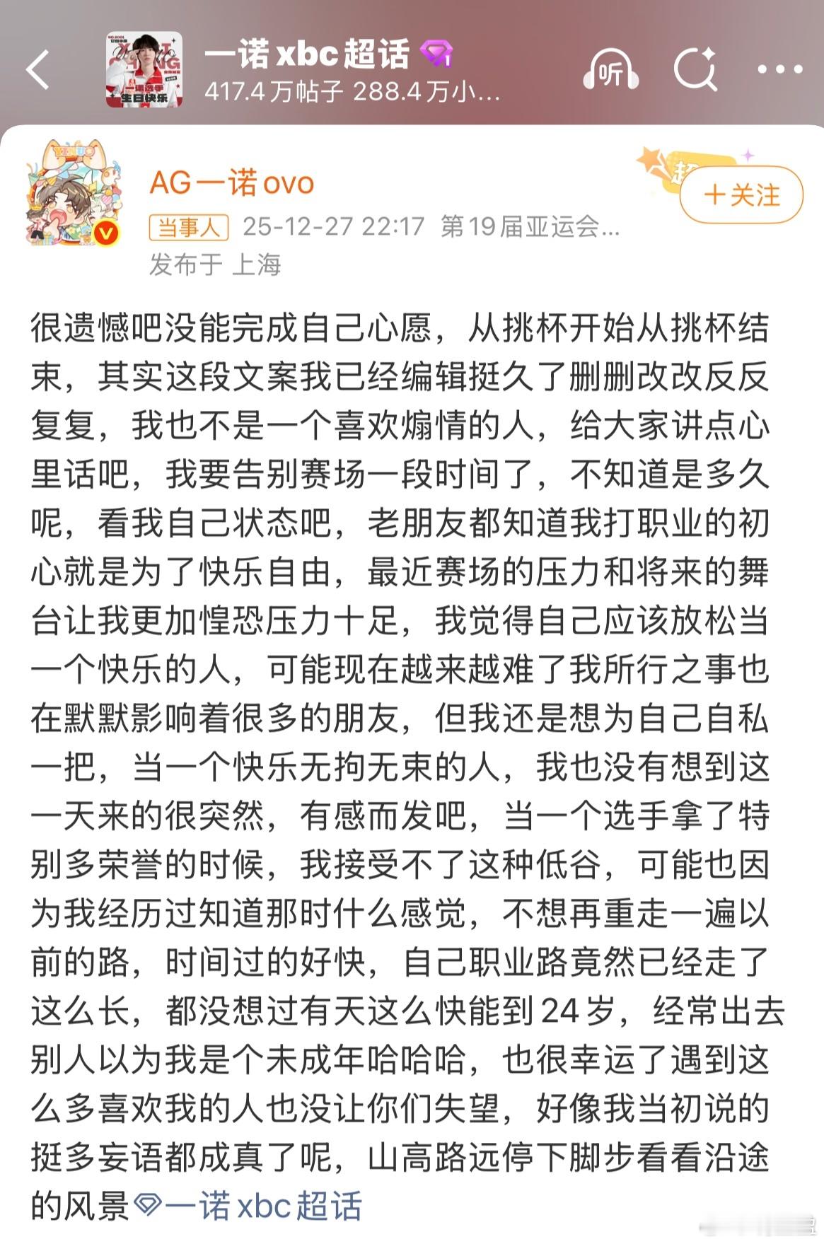 一诺暂时告别赛场 从青涩少年到赛场传奇,一诺用操作书写了太多高光时刻。如今他选择暂时停下脚步,去做回那个追求快乐自由的少年。职业电竞的压力从不是说说而已,他的坦诚与“自私”,反而让我们看到了选手卸下光环后的真实与勇敢。山高路远,愿你在沿途风景里找到真正的快乐✨ 等你调整好状态,赛场永远有你的位置,我们等你回来!