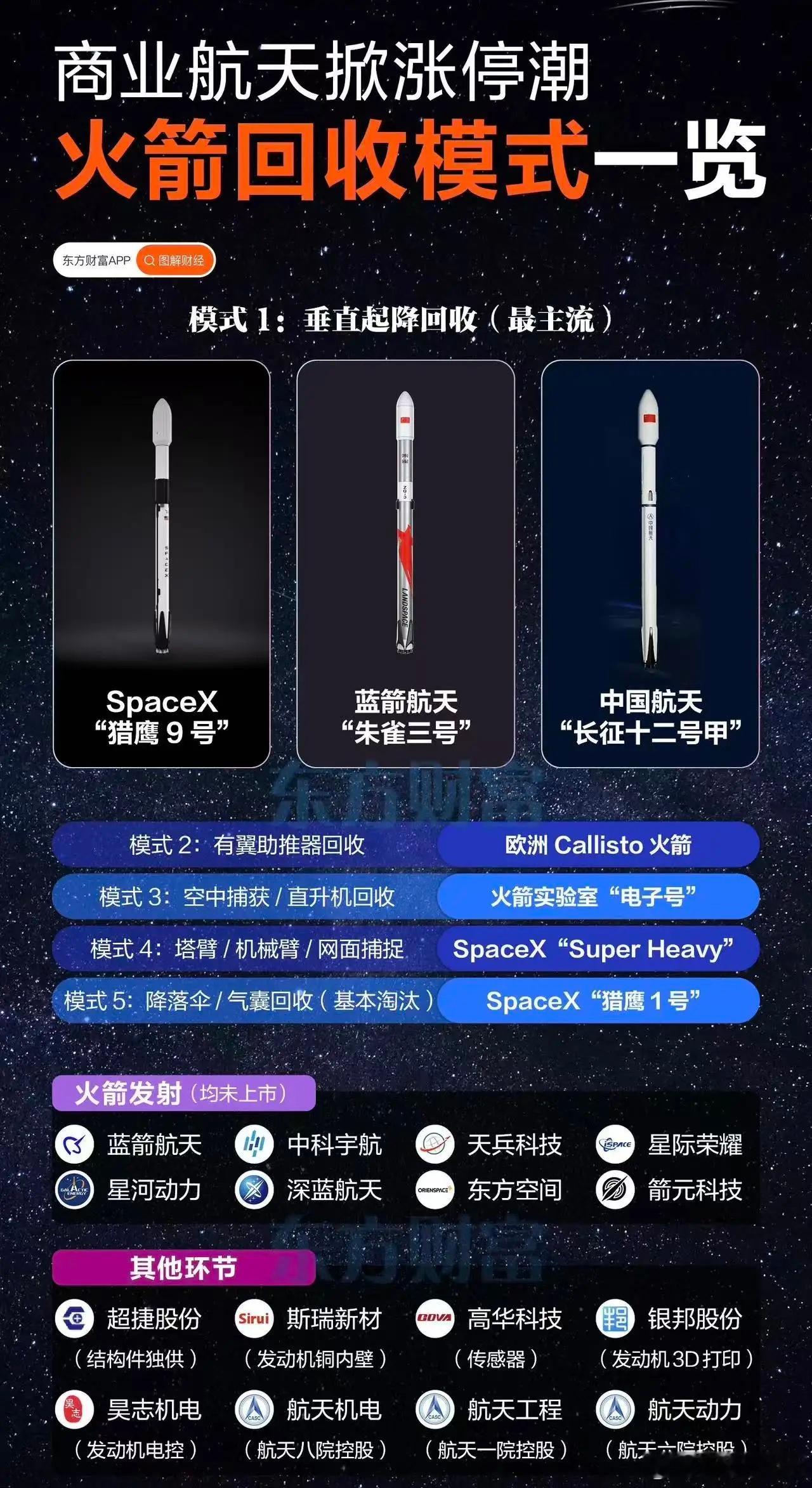 商业航天掀涨停潮 火箭回收8家公司,其中一家重点关注【火箭回收概念股梳理】商业航天本周高潮,走强的分支就是 火箭回收方向,主要原因就是 火箭回收 朱雀三号长征12甲的回收都出现了问题,那么接下来火箭回收的试验 还会密集的到来上交所发布了关于商业火箭的科创板符合第五套上市标准的 细则,这就是已经很明显了,明年要与 speax来进行竞争,接下来会为 火箭回收类的公司开绿灯 加速IPO目前国内火箭回收类公司 还未上市 (加速IPO中) 蓝箭航天 星河动力中科宇航 深蓝航天天兵科技 东方空间星际荣耀 箭元科技科创板细则明确强调符合火箭回收技术 作为上市的一个标准,这八家都是这个方向,目前重点是蓝箭航天 虽然朱雀三号的回收失败了,但是在2026年依然还是会继续在测试而且蓝箭航天 完成了上市辅导 目前按照进度来说 比沐曦的上市流程还要快,可以预见的是 蓝箭航天 大概率会在2026年上半年首发过会。 剩下的七家也会加速进行。所以火箭回收 也就是火箭重复利用方向 2026年依然是很大的空间发展。这八家的持股方和相关产业链 大家重点关注 觉得有用点赞关注