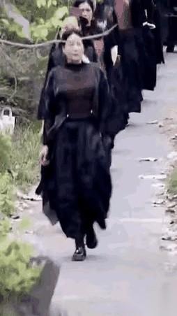 一群女人,穿着一模一样的黑裙子,在乡下小路上暴走。 一手插兜,谁也不理。 表情嘛