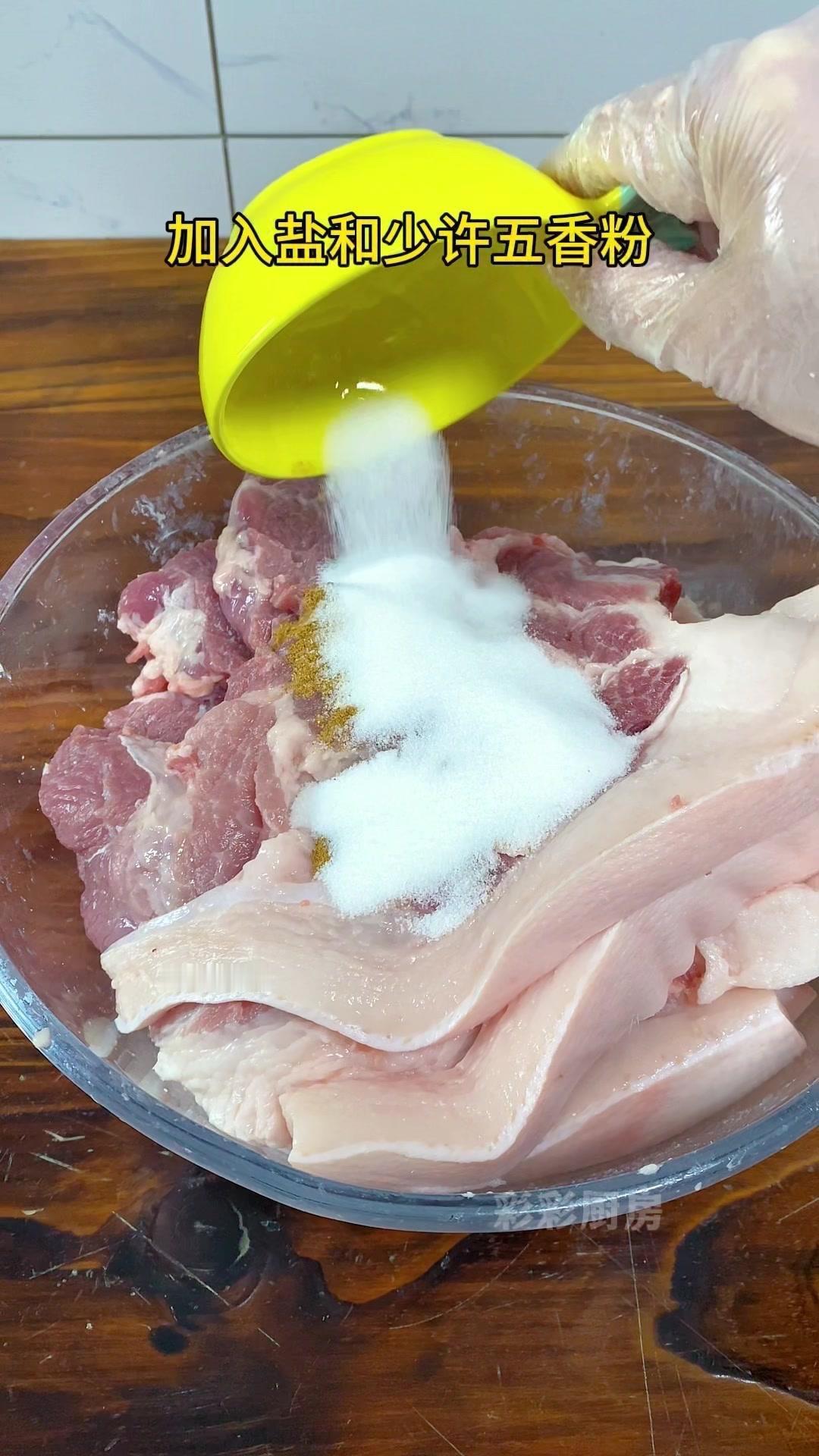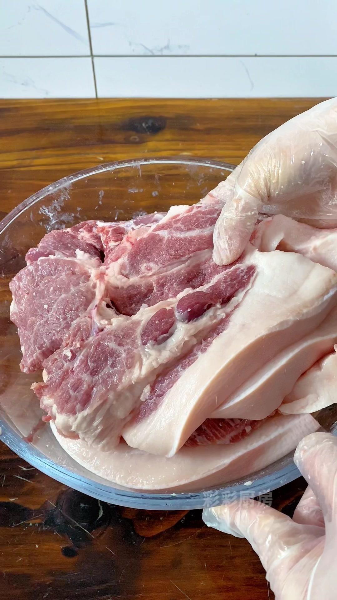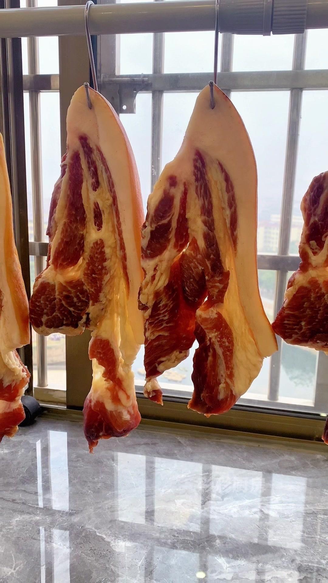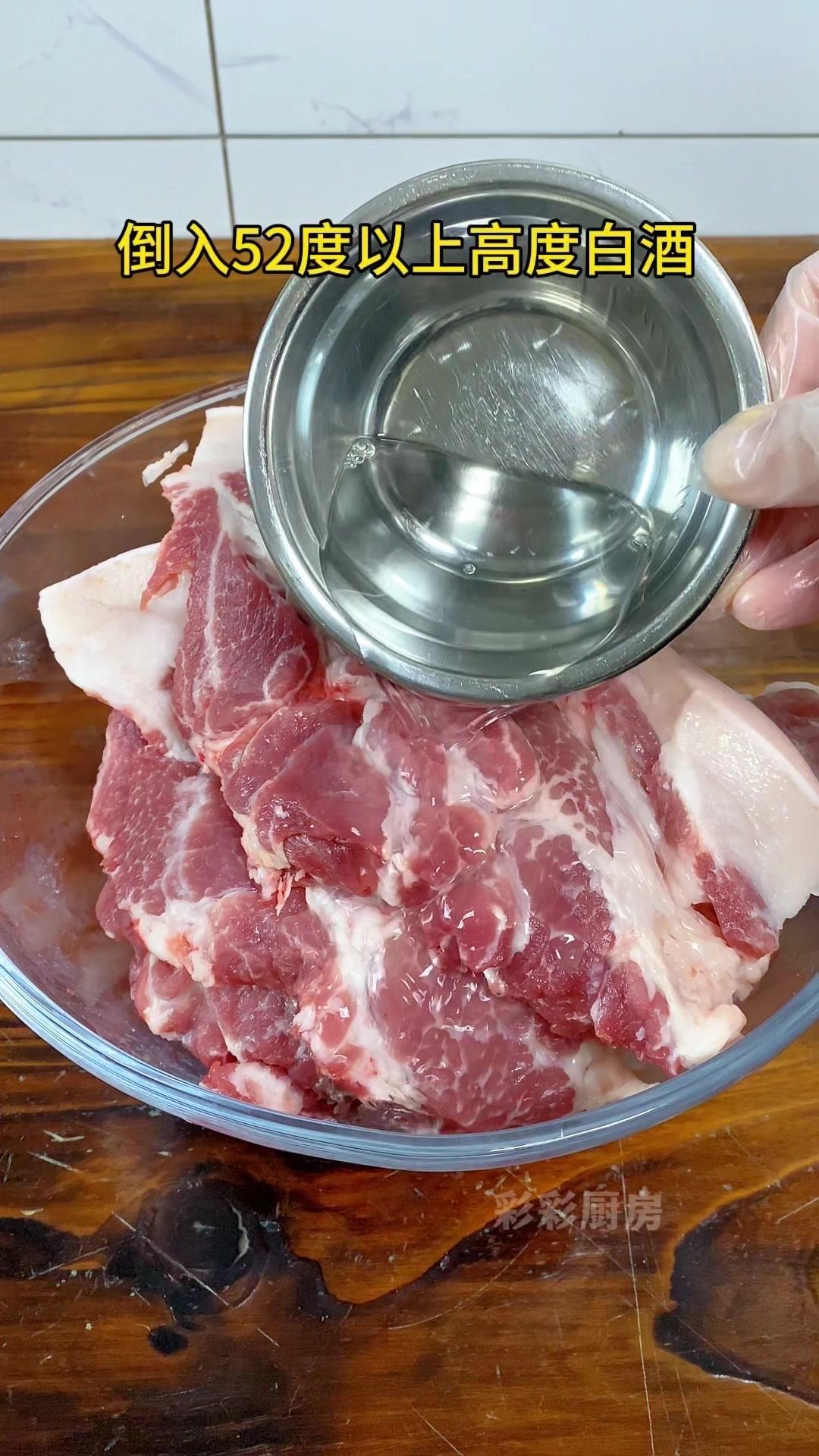 猪前腿肉不要洗,直接倒入52度以上高度白酒充分拌匀,再加入盐和少许五香粉翻拌涂抹均匀,确保每个位置都到位。 腌制两天,中间翻几次,然后挂在通风处晾7-10天就完成啦!