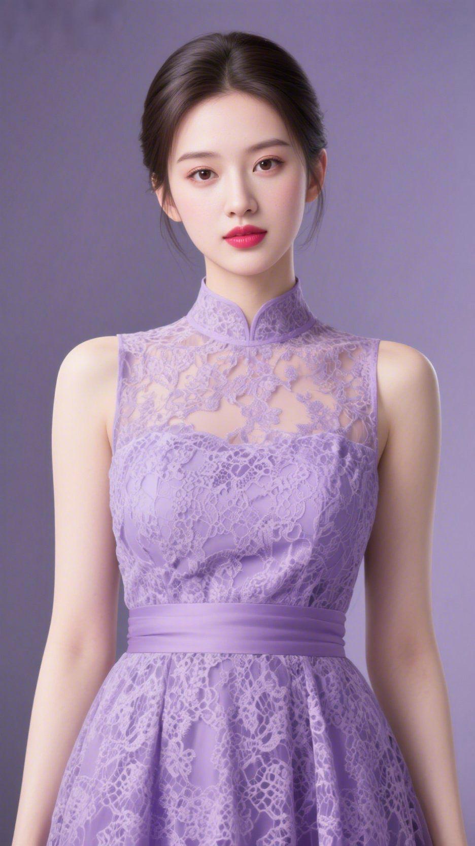 紫裙栖梦,柔意轻笼 浅紫蕾丝裹着纱,恰似春夜薄雾织进了裙裾。立领是中式的温婉,轻贴颈间,镂空花影顺着肩线舒展,如沾露的紫藤静垂肩头。 缎带轻束腰际,将柔意收作恰好的弧度。裙摆似盛着月光,每道褶皱都裹着软风——空气里漫开淡紫的温,像含了颗清甜的浆果,甘味缓缓漾开,浸满眼底。 她立在浅紫的朦胧里,眉梢轻垂,唇色如樱,连气息都沾着蕾丝的软。原来温柔从不是喧嚣,是一身紫裙裹藏的软,是眸中落着的轻,是恰好撞进视线里的、不慌不忙的暖。 中式礼服美学 温柔系穿搭