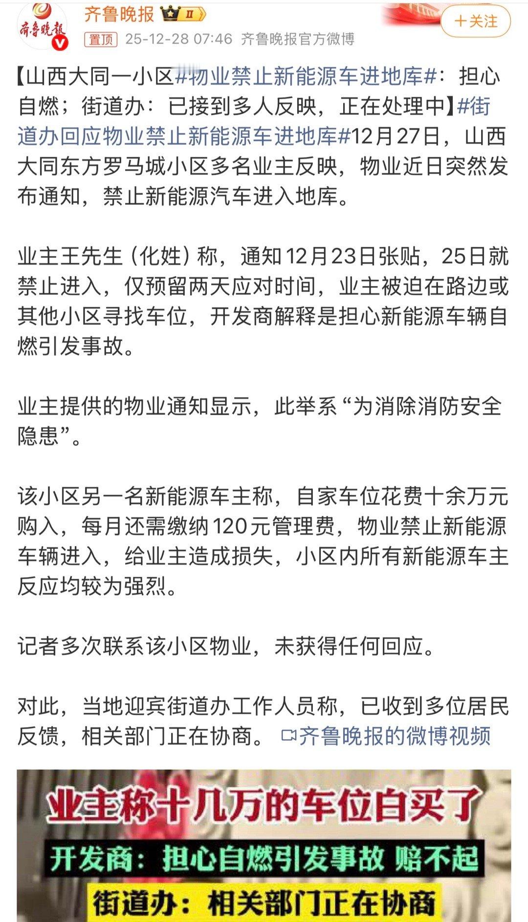 小区物业禁新能源车入地库 物业的安全顾虑能理解,但“一刀切”禁止新能源车进库太离谱。业主花钱买的车位有合法使用权,物业单方下禁令,既没协商也没替代方案,明显侵权。希望能拿出升级消防设施、划定专用停放区这类科学办法,安全管理总不能以牺牲业主合法权益为代价。街道办回应物业禁止新能源车进地库
