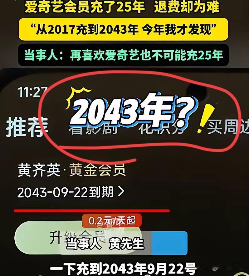 “我家追剧用的是iQIYI,今天在家里追剧,发现我的iQIYI会员到2043年才到期。我才知道我家人几年前给我一次性充值了25年的iQIYI会员,我非常不满意。” 黄先生说,他并不觉得家人充25年会员的做法有多好,家人觉得这25年的钱充的值。黄先生说,他觉得充这么长时间不合适,想退费,于是就拨打了iQIYI平台的客服。 没想到退费退的麻烦,黄先生当初充值时用的是一个支付宝账号,而现在这个支付宝账号已经被别人注册了。 黄先生说:“iQIYI充值的时候显示的是我用的支付宝账号,可是现在这个支付宝账号已经被别人注册了。iQIYI平台的客服说只能原路退回。” 黄先生的事情在网上发出了,很多网友都在围观,有人说:“iQIYI这规则挺合理的,既然你充值的时候用的是这个账号,那就应该原路退回才对。” 也有网友说:“这用户的权益受到了影响啊。” 黄先生的事情告诉我们,超长期充值要谨慎,还有涉及到钱的账号一定要有控制权。