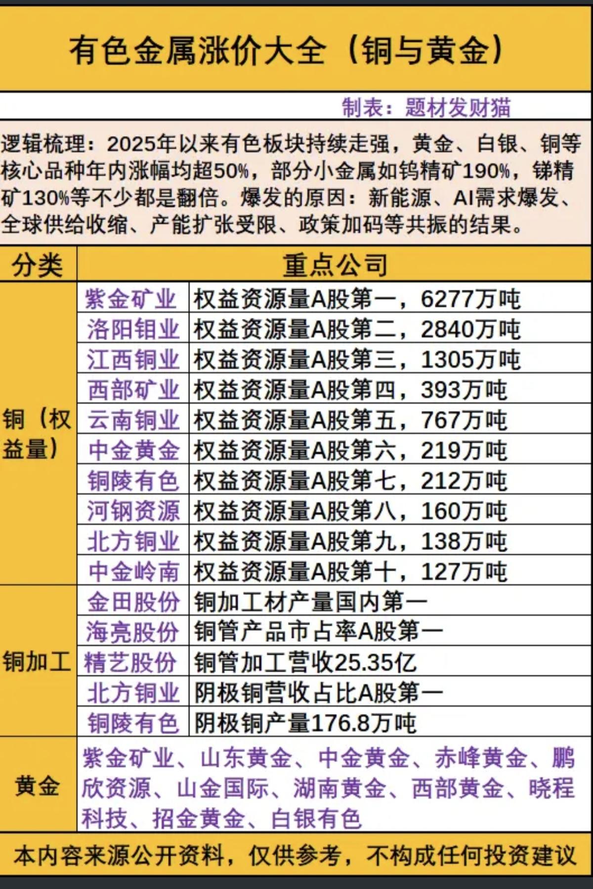有色金属涨价概念!(全) 铜,钨,金,银! 核心龙头股:营收,销量,储量!