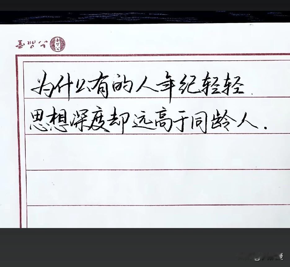 一个人的思想深度 主要取决于他的家庭背景 受教育程度 读过的书,走过的路,经历过的事 以及跟过哪些高人学习 看看郭靖就知道,他要是一直跟着江南七怪学习,也就是三流水平 认识了黄蓉,打开了他的视野,师从于洪七公,周伯通,一下子就进入了一流顶尖高手。所以一个人思想深度如何,和年龄并不是正相关。