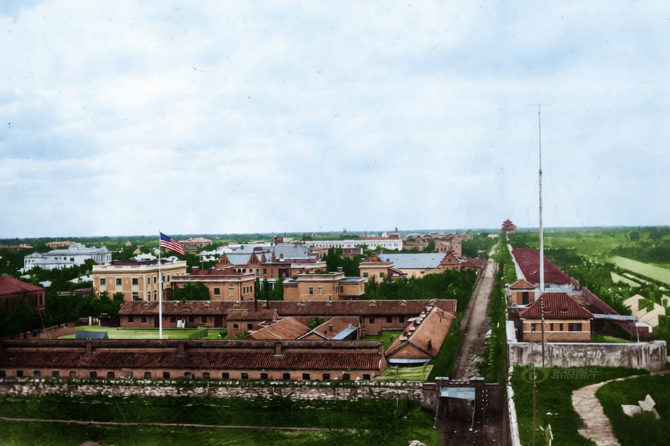 这张照片拍摄于20世纪20年代,北京东交民巷使馆区内美国公使馆及其兵营的鸟瞰图。从高处俯瞰,左侧建筑群即美国使馆及兵营区,醒目悬挂美国国旗;右侧高耸旗杆旁为另一建筑群,中间宽阔街道为东交民巷主干。 东交民巷(原东江米巷)自1860年代起渐成外国使馆区,1900年义和团运动围攻使馆、八国联军侵京后,1901年《辛丑条约》正式划为“使馆界”:界内中国人不得居住、各国自行管理并驻兵防守,美国使馆及兵营占地最大(西段靠近天安门广场东侧,南至城墙)。美国驻兵最多时达数百人,日常操练于广场,一战后列强调整,美国使馆维持至1949年。1950年北京市军管会收回兵营地产,结束外国驻兵历史。