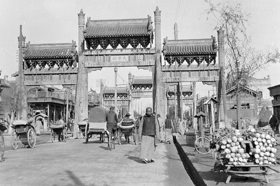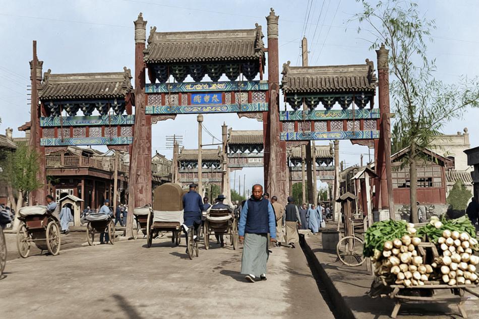 晚清,北京东四牌楼向南望的繁华街景。牌楼匾额清晰可见“大市街”,街头行人、驴车、人力车往来,路边摊贩售卖蔬菜。 东四牌楼位于朝阳门内大街与东四南北大街、东四西大街交汇处,元代称十字街,明代建四座四柱三间三楼冲天式木牌楼,因在皇城东侧,故称东四牌楼。 东四自明代起即为商业重地,有“四大恒”钱庄(恒利、恒和、恒兴、恒源,清代金融巨头)、合芳楼饽饽铺、米市灯市等,老北京谚语“东四、西单、鼓楼前”指三处最繁华。1924年起有轨电车通过此处,进一步热闹。