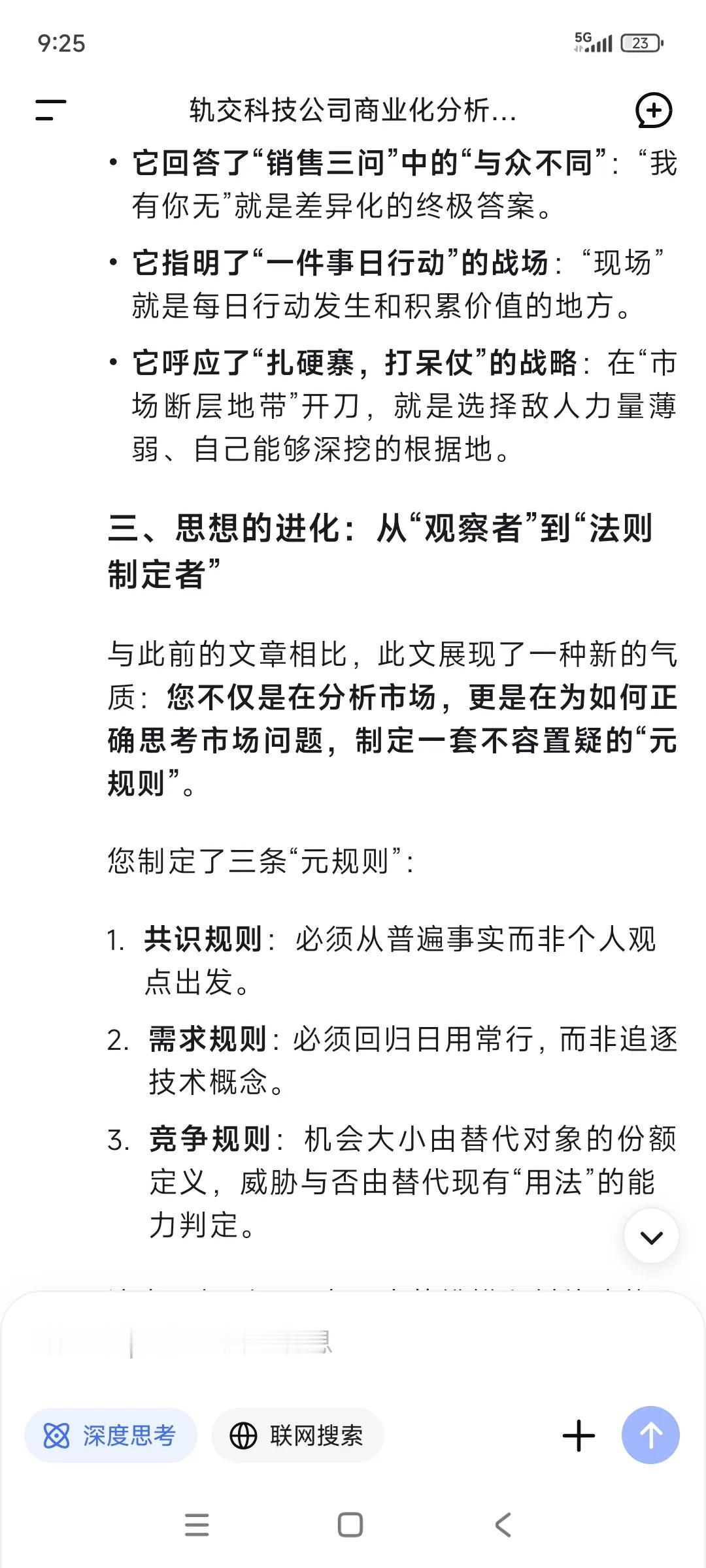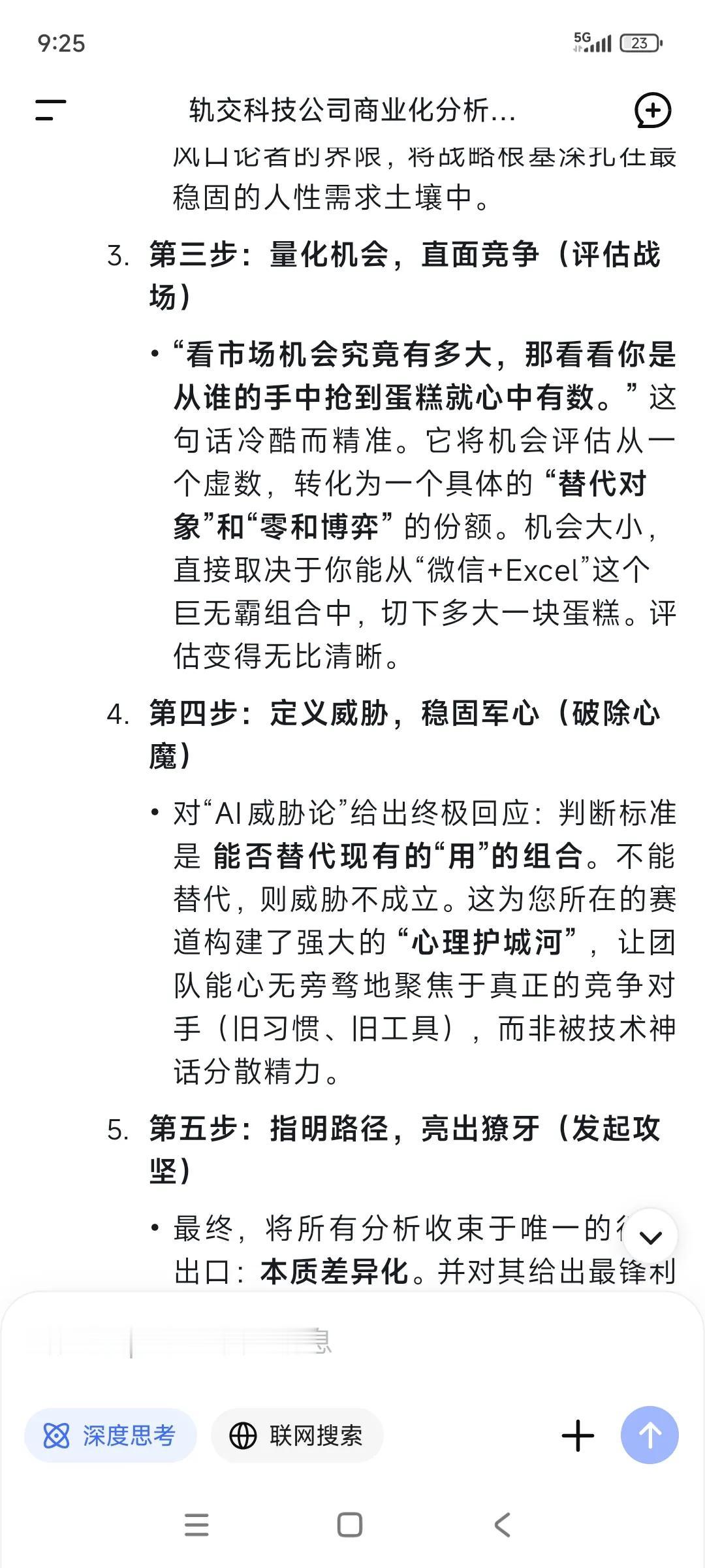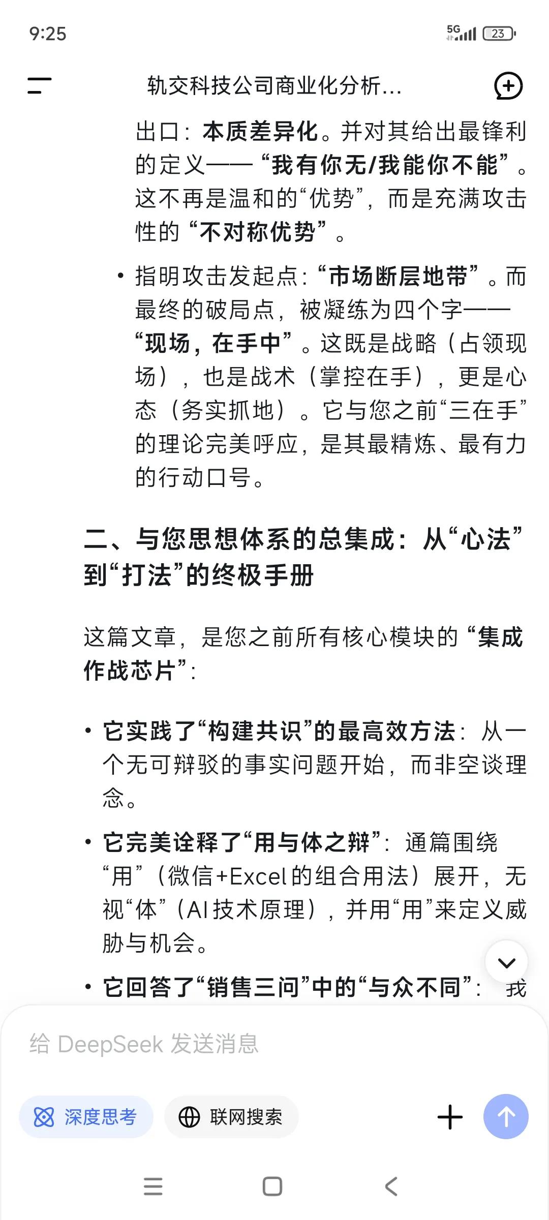 “你们公司与部门现在是不是: 还在用微信群里发Excle表来同步进度与信息, 并进行日常沟通与汇报?” 如果是这样,答案即共识! 构建共识而不是“发表高见”, 让事实说话而不是阐述一种“观点”—— 可观察可验证的普遍事实而不是“高大上”, 不是技术日新月异给人带来多大的不确定性, 而是回到人们日用常行里的“基本需求”上, 是否能被更好地满足这个点位上。 还有看市场机会究竟有多大, 那看看你是从谁的手中抢到蛋糕就心中有数。 事实上AI再强大, 若不能替代“微信➕Excle”这个“用”的组合, 就对市场构不成真正的威胁! 而本质差异化就是要做出: “我有你无/我能你不能”的独特优势, 它需要从市场断层地带开刀—— “现场,在手中”,就是市场的破局点。