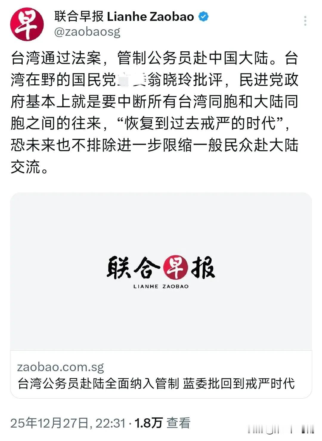 新加坡联合早报昨晚(12月27日晚)报道:“台湾通过法案,管制公务员赴中国大陆。台湾在野的国民党民代翁晓玲批评,民进党政府基本上就是要中断所有台湾同胞和大陆同胞之间的往来,‘恢复到过去戒严的时代’,恐未来也不排除进一步限缩一般民众赴大陆交流。” 评几句 民进党把“防火墙”修到自家公务员脚下,恰恰暴露了两层心虚:其一,怕台湾基层官员亲眼看见大陆发展机遇,回岛戳破“去中”谎言;其二,怕两岸社会越走动,“天然独”越变“自然统”。一纸行政戒严令挡不住人流、物流、心流,只会在岛内生成新的“绿色恐怖”叙事,加速中间选民觉醒。
