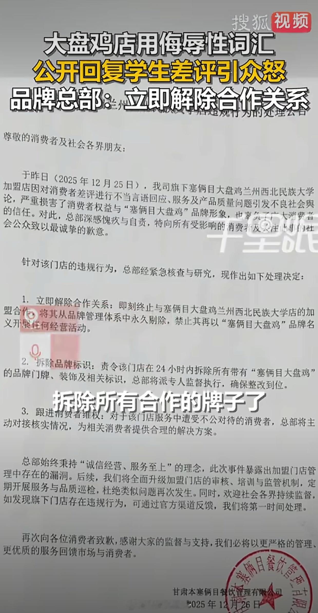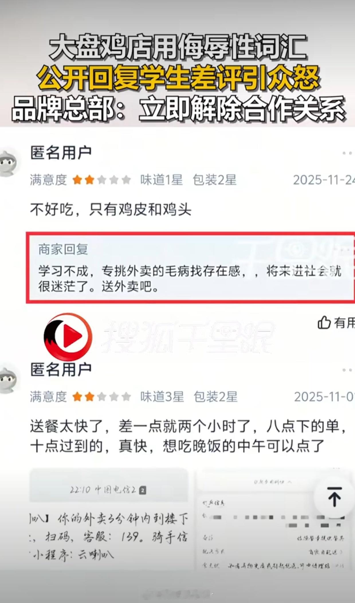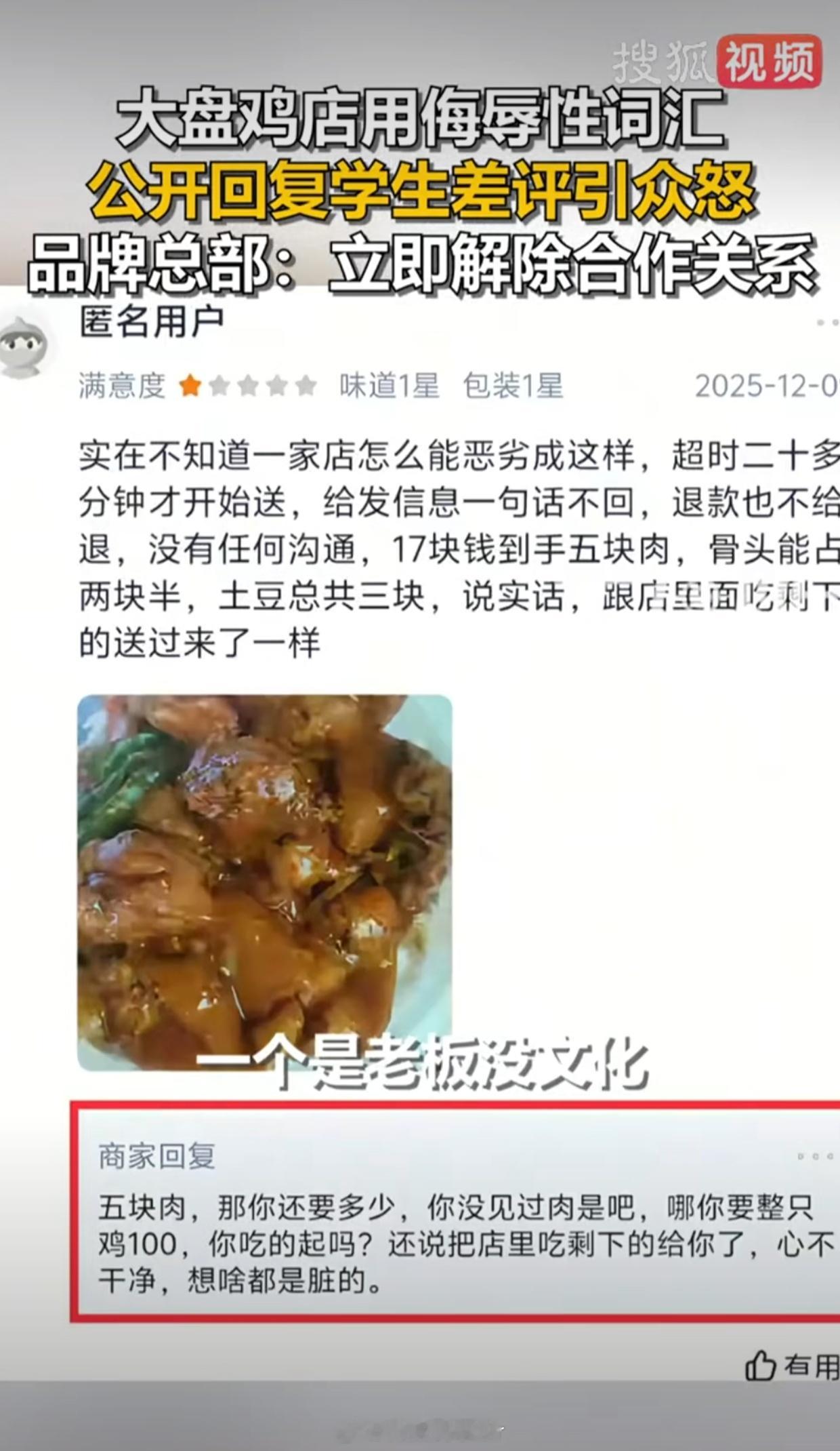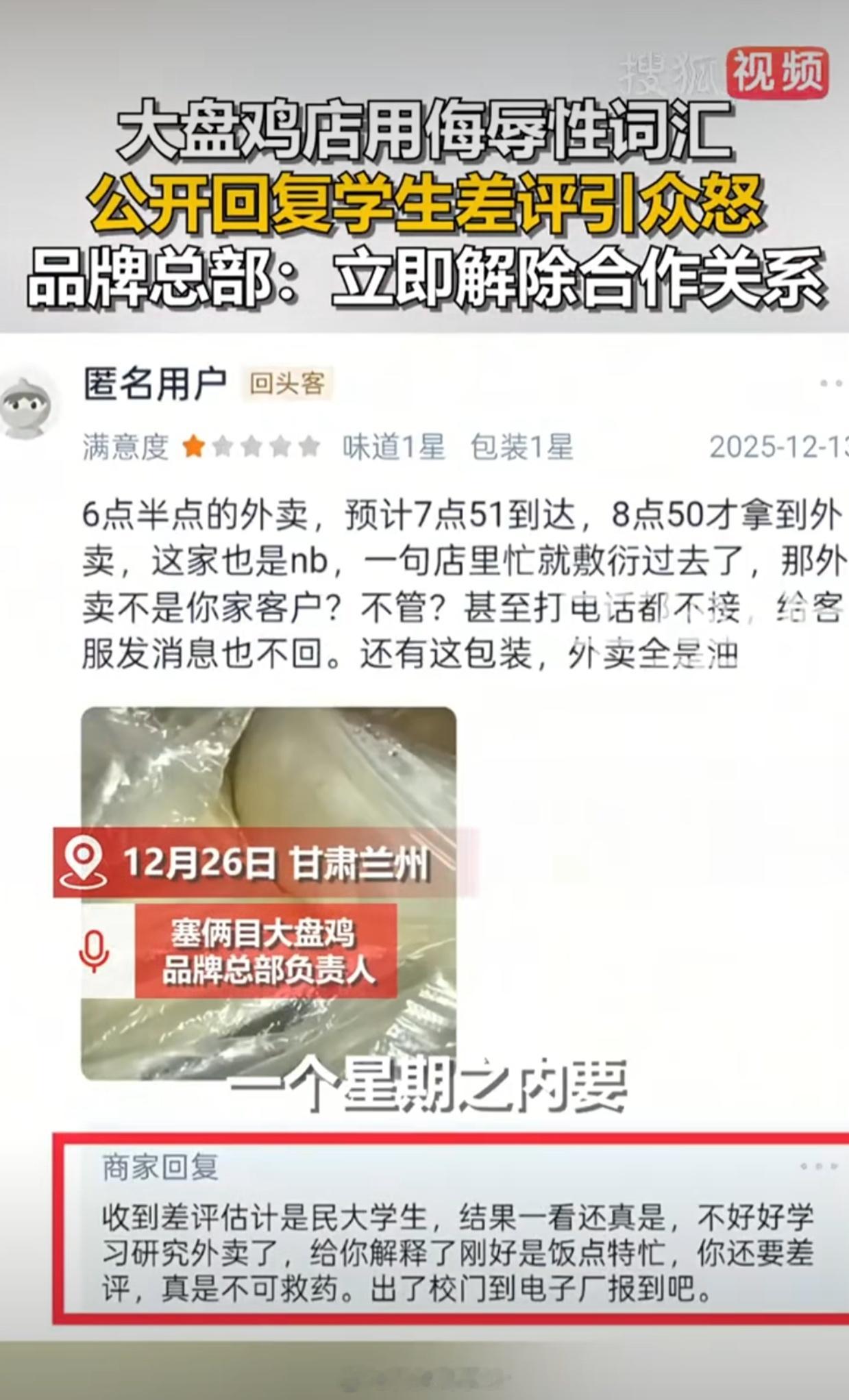 大盘鸡店侮辱性回复学生差评被摘牌老板是超雄吗?连总部的都敢骂平等创飞每一个人
