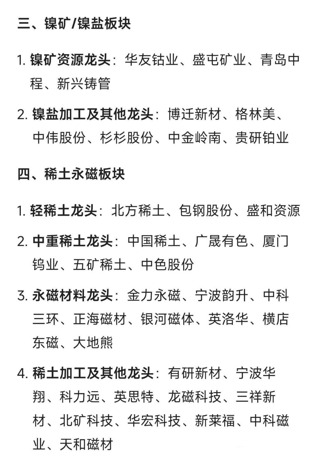 能源金属产业链龙头大汇总…一、锂矿/锂盐板块锂辉石矿龙头:天齐锂业、融捷股份、西藏矿业盐湖提锂龙头:盐湖股份、藏格矿业、科达制造锂云母/锂瓷石矿龙头:永兴材料、江特电机、中矿资源锂盐加工及其他龙头:赣锋锂业、盛新锂能、雅化集团、永杉锂业、金圆股份、国城矿业、大中矿业、威领股份、西藏城投、西藏珠峰、川能动力、天华新能二、钴矿/钴盐板块钴矿资源龙头:华友钴业、洛阳钼业、鹏欣资源、盛屯矿业钴盐加工及其他龙头:腾远钴业、寒锐钴业、格林美、银禧科技、海南矿业、中国电建、当升科技三、镍矿/镍盐板块镍矿资源龙头:华友钴业、盛屯矿业、青岛中程、新兴铸管镍盐加工及其他龙头:博迁新材、格林美、中伟股份、杉杉股份、中金岭南、贵研铂业四、稀土永磁板块轻稀土龙头:北方稀土、包钢股份、盛和资源中重稀土龙头:中国稀土、广晟有色、厦门钨业、五矿稀土、中色股份永磁材料龙头:金力永磁、宁波韵升、中科三环、正海磁材、银河磁体、英洛华、横店东磁、大地熊稀土加工及其他龙头:有研新材、宁波华翔、科力远、英思特、龙磁科技、三祥新材、北矿科技、华宏科技、新莱福、中科磁业、天和磁材