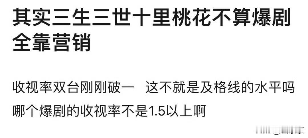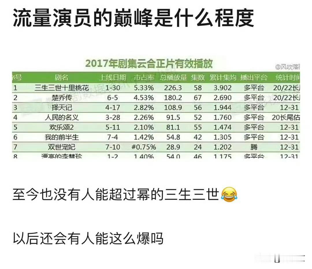 谁说《三生三世》不爆?3.9亿播放量直接打脸!看到有人说《三生三世十里桃花》不算爆剧,我简直惊呆了! 居然拿收视率说事,这都什么年代了,还只看电视台那点数据? 知道这部剧当年有多火吗? 云合集均播放量3.9亿,这纪录到现在都没人破! 全网刷屏,热搜霸榜,街头巷尾都在讨论,这都不算爆剧,那真不知道什么才算。 评判爆剧得看综合影响力,不能死盯着一个指标。 收视率只是冰山一角,网络播放量、社交讨论度、出圈程度才是现在更重要的标准。 在这些方面,《三生三世》的表现简直是碾压级别的。 数据摆在这儿还不认,那我也无话可说了。