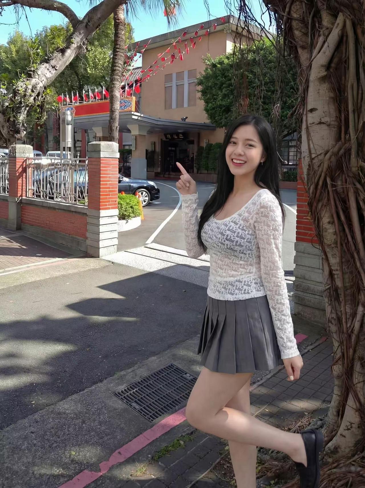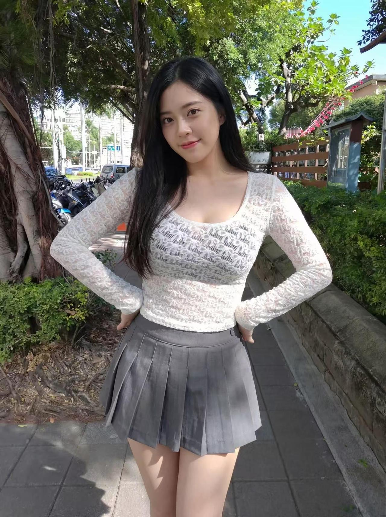 阳光下的甜美少女,白色蕾丝上衣搭配灰色短裙,清新自然,今日打卡拍照