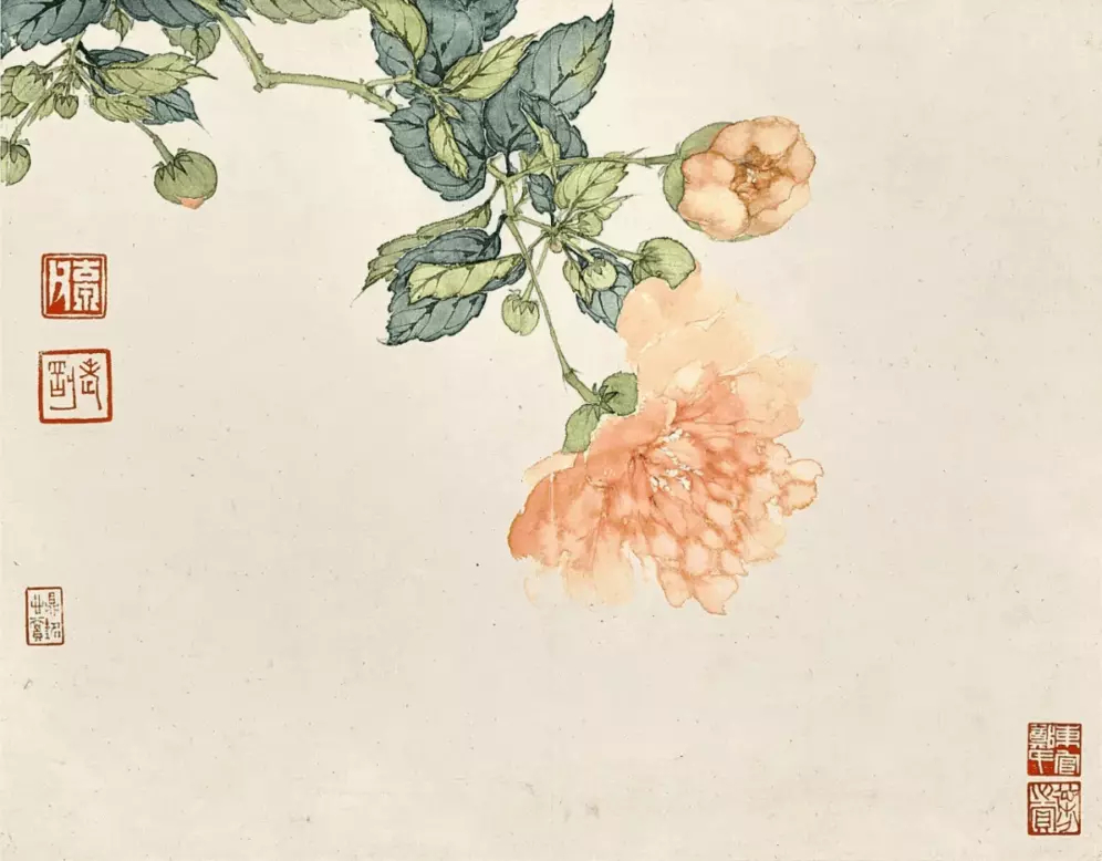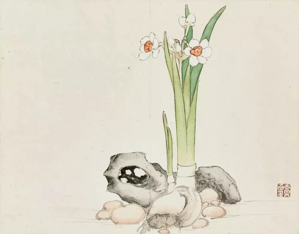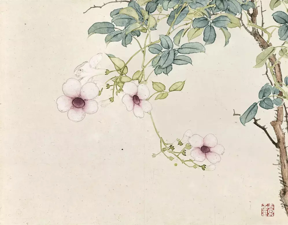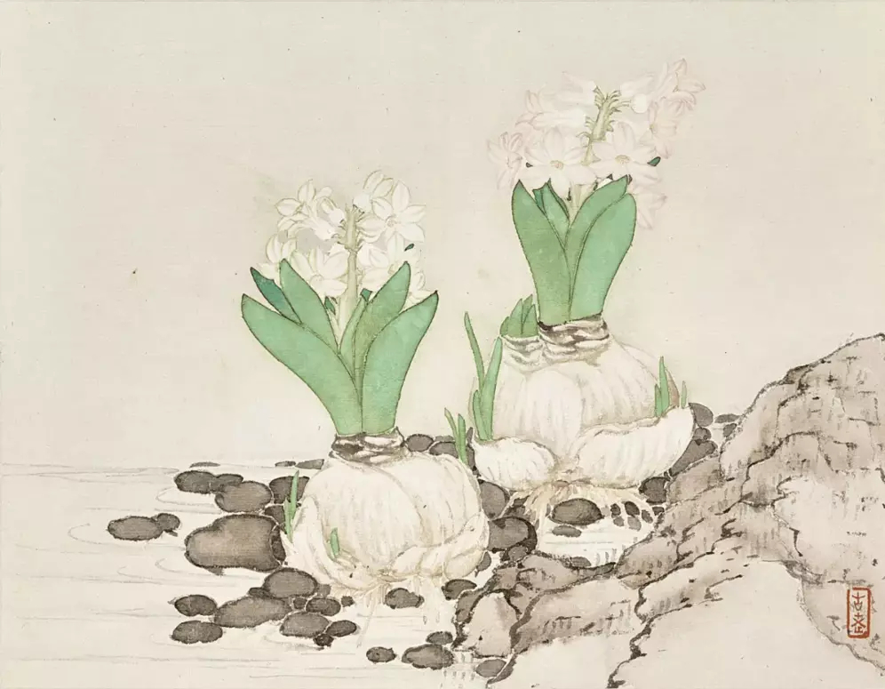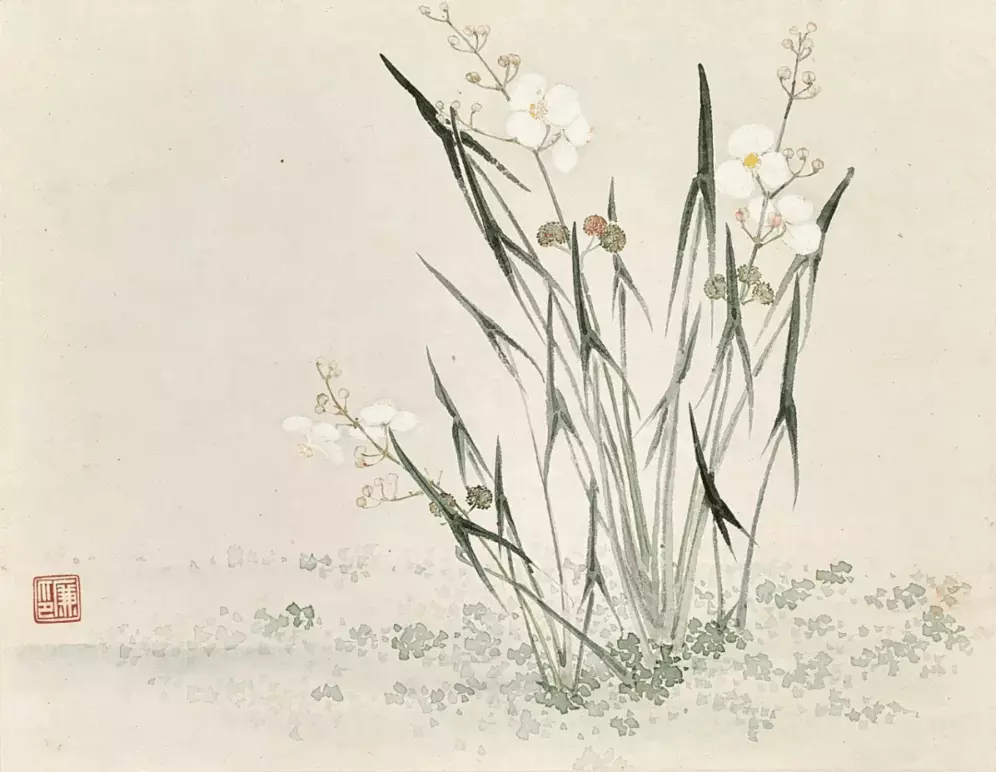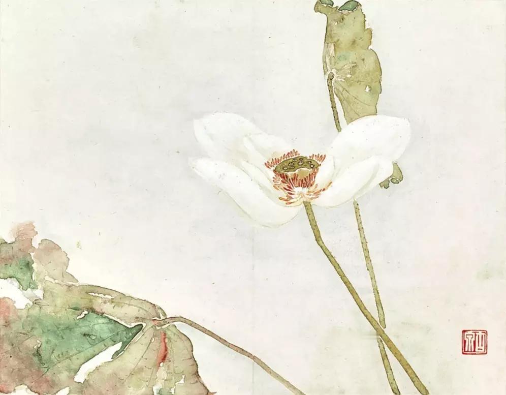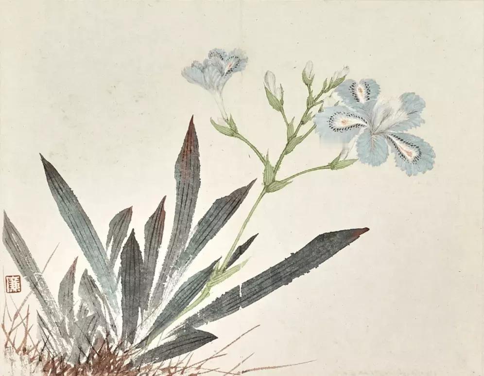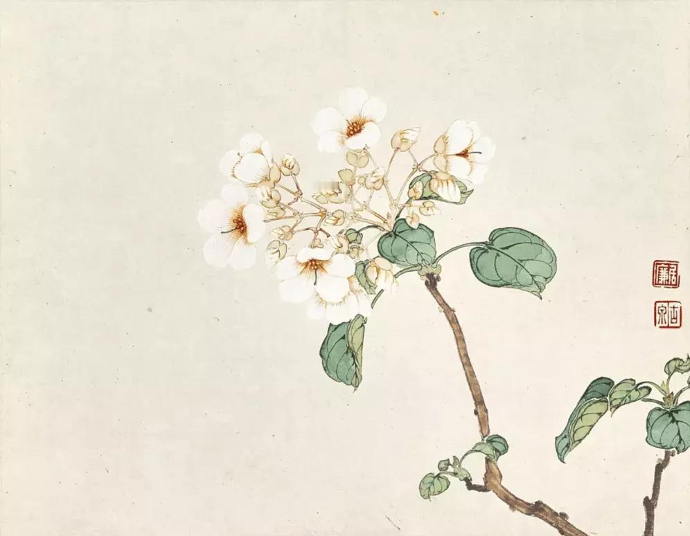 清 居廉 清逸出尘册。居廉笔下的作品多小写意花卉。册中分别绘有白荷、水仙、双色牡丹、梨花、鹤顶兰、鸢尾花、僧鞋菊、野茨菰、白蝶兰、风信子、红花荷......等,可见其掇集花形之广,随手拈之入画。这就是中国风遇见艺术