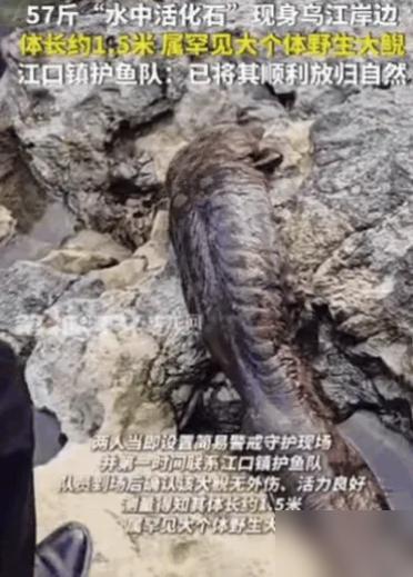 “幸亏发现及时!”重庆一大哥在乌江附近干活时,突然发现身旁石头缝有动静,起初,他以为是蛇,结果凑近一看,才发现是一条“牢底坐穿鱼”,即野生大鲵,又叫“娃娃鱼”,这条野生大鲵长约1.5米,重57斤,工作人员:这条大鲵已经活了至少20年了,是“水中老寿星”! 说真的,在野外干活能碰到这种“重量级”嘉宾,胆量和素质缺一不可。当时郑强兄弟俩正在乌江边忙活,先是听见石缝里有沉闷的响动,大着胆子查看,才发现这个一米多长的大家伙正慢吞吞地挪动。 最让我佩服的是兄弟俩的应对方式。看清是野生大鲵后,他们第一反应不是好奇去摸,而是赶紧找来树枝和绳子,在石滩上给它围了一个简易的“安全区”,守在那儿不让别人靠近,这种保护意识真的没谁了。 57斤的分量在娃娃鱼界绝对算得上是“巨无霸”级别了,在野外安稳活过20年也挺不容易。我觉得这鱼其实就是乌江水质的“活招牌”,这种动物对环境极其挑剔,稍微有点污染都待不下去,能长这么大说明那里的生态确实养人。 现在大家常调侃说“长得越怪,判得越快”,这其实是件好事。这种深入人心的法律意识,让普通人在面对这种“牢底坐穿鱼”时,首先想到的是敬畏和守护,而不是其他的念头。 后来护鱼队检查确认它身体没毛病,特意挑了个水流平缓、平时没人去的深水区给放了。看着这种“活化石”重回碧波,那种生命归位的仪式感,感觉比任何说教都有力量。 希望这位20岁的“老邻居”在水里继续安安稳稳地生活。只要咱们都能像这兄弟俩一样,对自然界这些生灵保持一份克制和善意,咱们的家园环境肯定会越来越好。