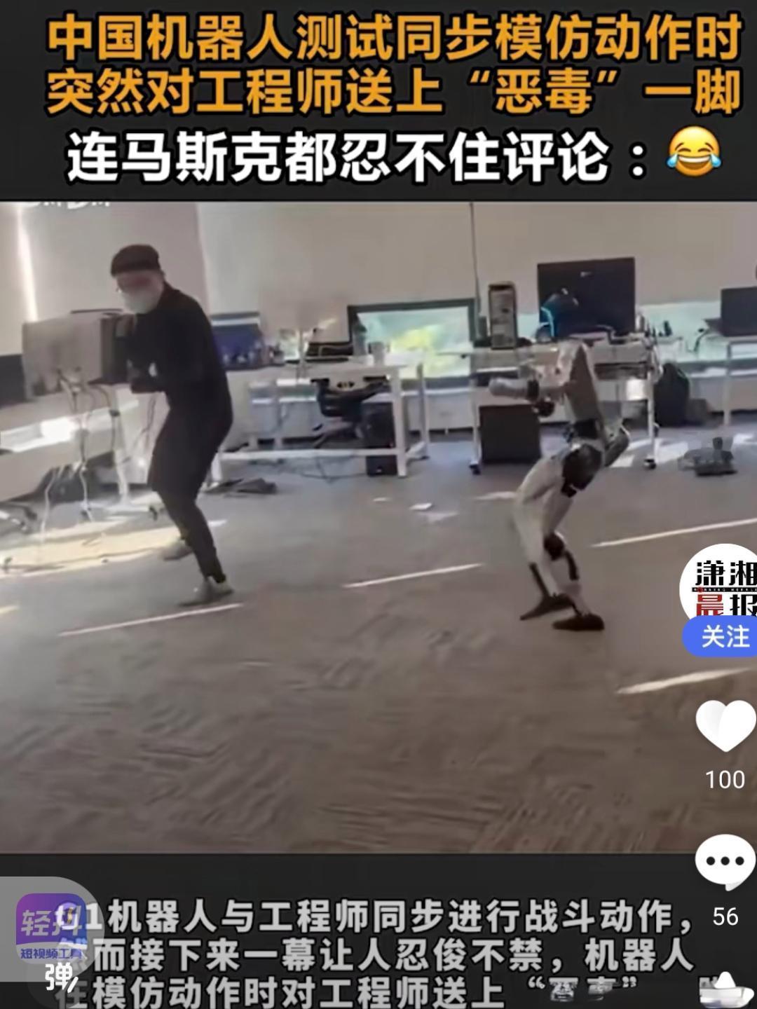 近日,中国机器人在测试同步模仿动作时,突然踹工程师一脚! 工程师一边做各种武术动作示范,一边让机器人模仿:直拳刺探、左右勾掌、上勾掌、组合拳、前踢、左右侧踢…… 不料,不知哪根神经搭错了,机器人竟然对着身旁的工程师来了一记“无影脚”。 “哎呦喂,要我老命了” 更令人搞笑的是,这个机器人老弟踢完工程师老爹以后,把工程师捂档的动作也精准复刻了。 机器人:我忍你好久了[发怒] 工程师:说啥呢?你咋朝我动手了[灵光一闪] 机器人:你都说了模仿,如果不模仿,就不对了[笑哭] 旁观者:现在是踹一脚,以后拿刀怎么办? 难怪这一幕,连埃隆·马斯克都忍不住评论笑哭表情包。 网友:故意的,你们是怎么看的呢?