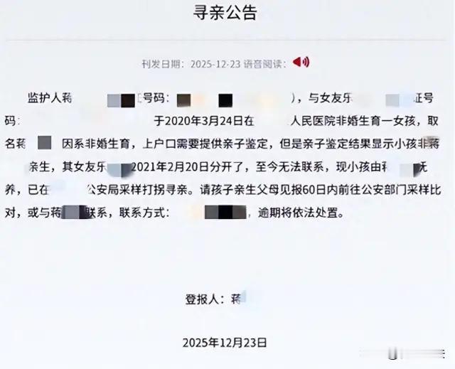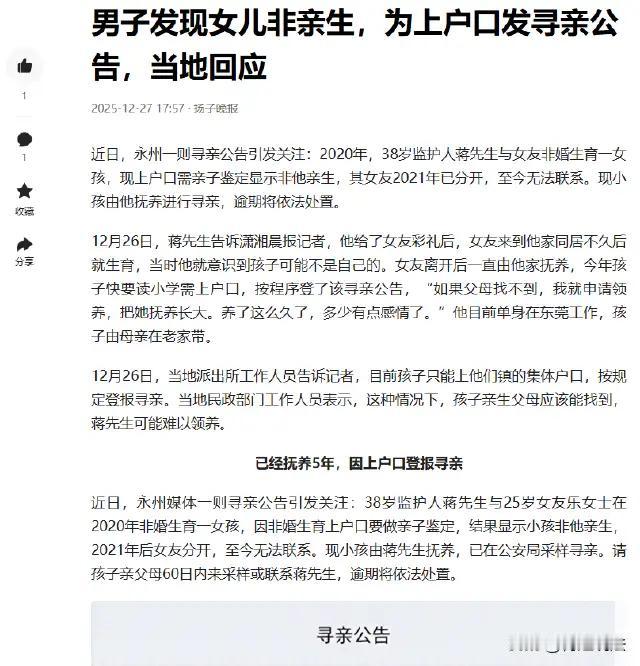 湖南永州,一段看似平凡的爱情故事,却因为信任的裂痕和责任的缺失,逐渐演变成一场撕心裂肺的亲情迷局。蒋先生通过介绍认识了乐女士,带着对未来美好生活的期待,付出了彩礼,迎来了乐女士搬来同居。半年后,乐女士为蒋先生生下了女孩,原本是喜悦的起点,却悄然埋下了疑虑的种子。蒋先生因为相处时间短,心里种下了“孩子非亲生”的怀疑,但他选择了默默承受,愿意为这份家庭的完整保持沉默。 然而,乐女士与前男友的频繁联系,让这段关系愈发紧张,摩擦不断。最终,她选择扔下孩子离开,消失在蒋先生的生活中。蒋先生踏遍娘家,却只得知乐女士去了外地,无人在消息中留下答案。于是,蒋先生和家人硬着头皮承担起对孩子的养育责任,默默守护了五年。孩子即将入学,蒋先生依法办户口时,亲子鉴定却无情地揭穿了这层伪装——孩子,竟不是他的亲骨肉。 这一刻,有多少父亲的心碎无法言说?被蒙骗五年的养育,是无尽的付出还是天大的讽刺?蒋先生选择发出寻亲公告,希望找到孩子的亲生父母,给孩子一个真正的归属;如果寻不着,他表示愿意继续承担抚养责任,给孩子一个温暖的家。 这件事折射出的是现实生活中复杂的人性和道德困境:信任一旦破裂,伤害不仅仅是夫妻间,更是无辜孩子的未来。而作为社会,我们又该如何帮助这些被遗忘的孩子,让他们不因成人的失误。爱情故事感悟 质朴爱情故事