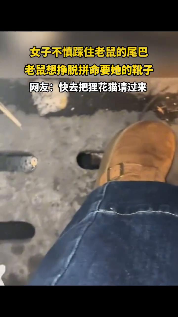 女子不慎踩住老鼠的尾巴,老鼠想挣脱拼命要她的靴子。 网友:快去把狸花猫请过来。