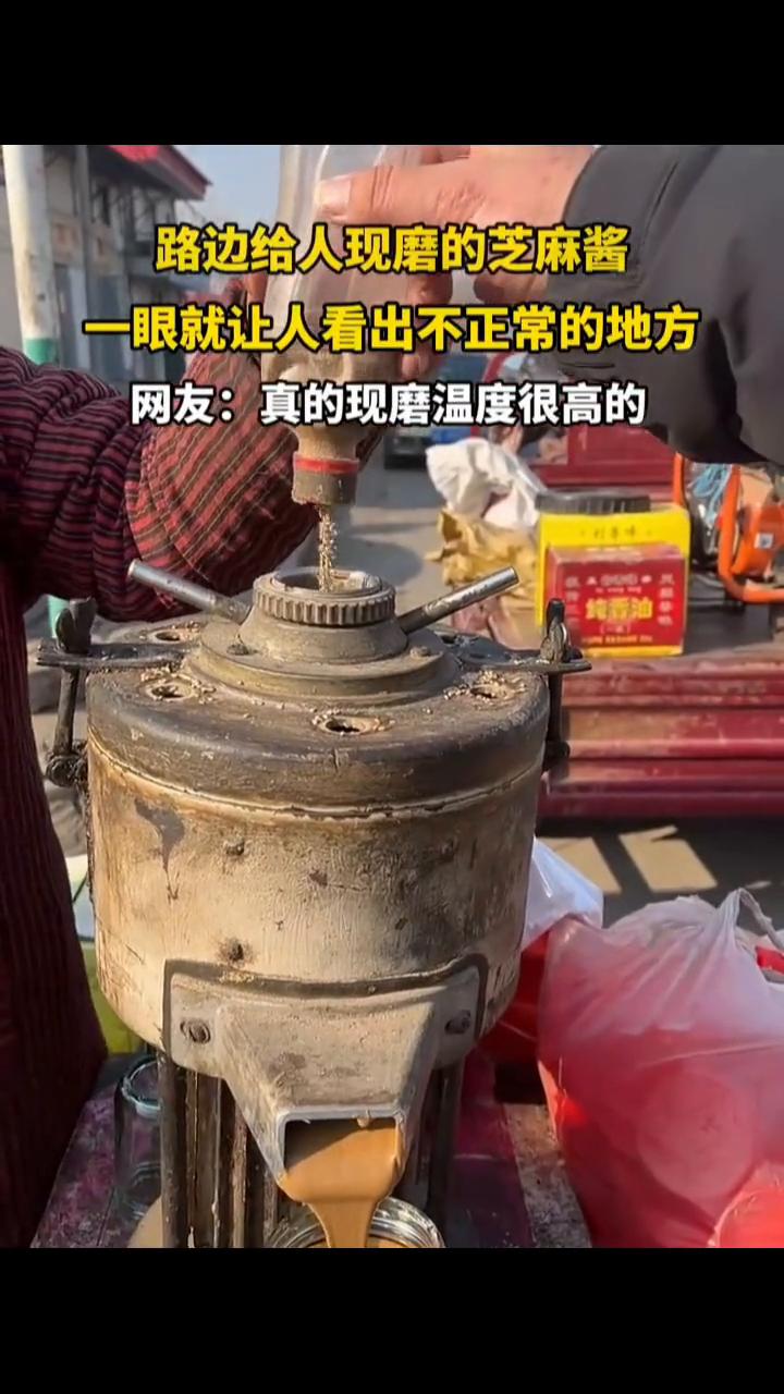 路边给人现磨的芝麻酱,一眼就让人看出不正常的地方。网友:真的现磨温度很高的。 发