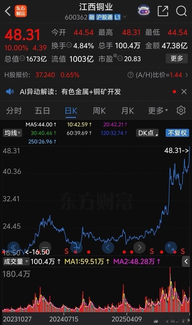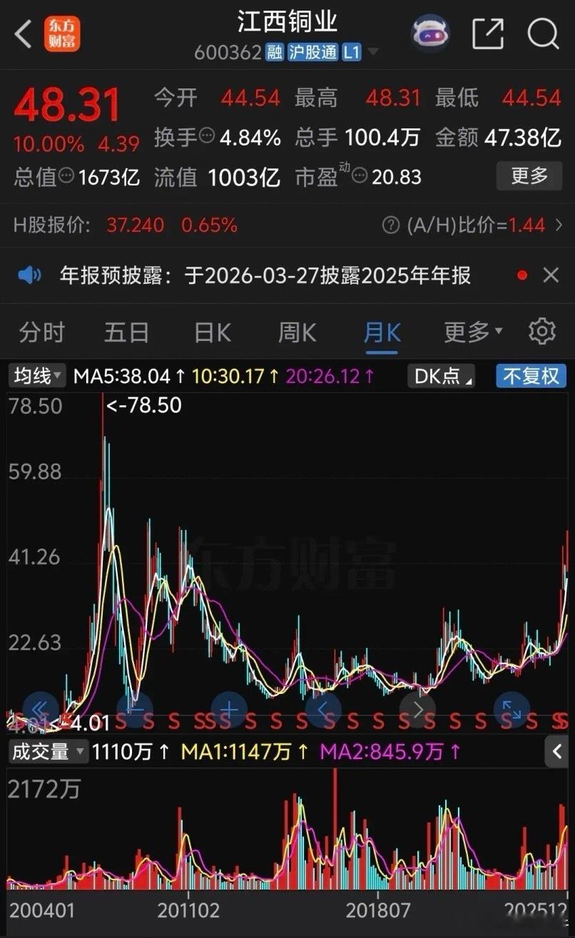 江西铜业高开高走拉升两波后涨停,股价再创新高站上48关口,牛市力量再次释放。股价再次回到48让我无限感慨,因为我15年前的2010年买过江西铜业,好像也是48左右,没赚几毛钱就卖了,后来再也没有买江西铜业,后来就一路下跌,14年跌到12块多,15年大牛市也没有涨回去,但是我没有买有色金属,主要仓位集中在银行股,万万没想到15年过去了江西铜业又可以涨回到48元,我想,牛市的力量太强了,只要是经营正常的股票都会涨一波或者几波,但最少会有一波。