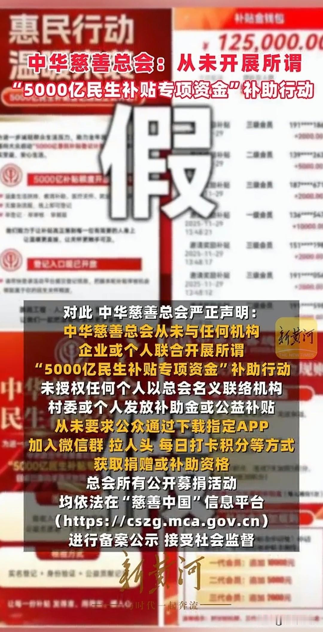 看到这些消息不要再被骗了, 近日网上流传着5000亿民生补贴专项资金是谣言,中华慈善总会表示从未开展此项活动。 今日网络上流传了很多中华慈善总会发言人以及领导的发言,这些人冒充中华慈善总会发言人以及中华慈善总会秘书长的身份,开设了中华慈善总会的工作会议! 宣称将会发布5000亿民生专项补贴资金,大家下载APP,并且每日打卡,有一些让人拉人头儿,用积分兑取补贴,这些都是骗子! 目前中华慈善总会已经辟谣了,从未开展过此项活动,也不会要求大家主动去下载一些APP,如果大家有捐款的需要,可以去中华慈善总会官网! 现在的网络很多信息都不是真实的,尤其是一些不法分子利用各种噱头,去欺骗很多民众,希望大家擦亮眼睛,不要下载陌生APP,不要给陌生人转账,避免自己的财产受到损失! 大家对于中华慈善总会辟谣这事怎么看? 中国捐款 捐款乱象 慈善捐款排名 国家捐款 慈善捐款排名 慈善作假 慈善排名 中国慈善透明度 慈善乱象 公益救助基金