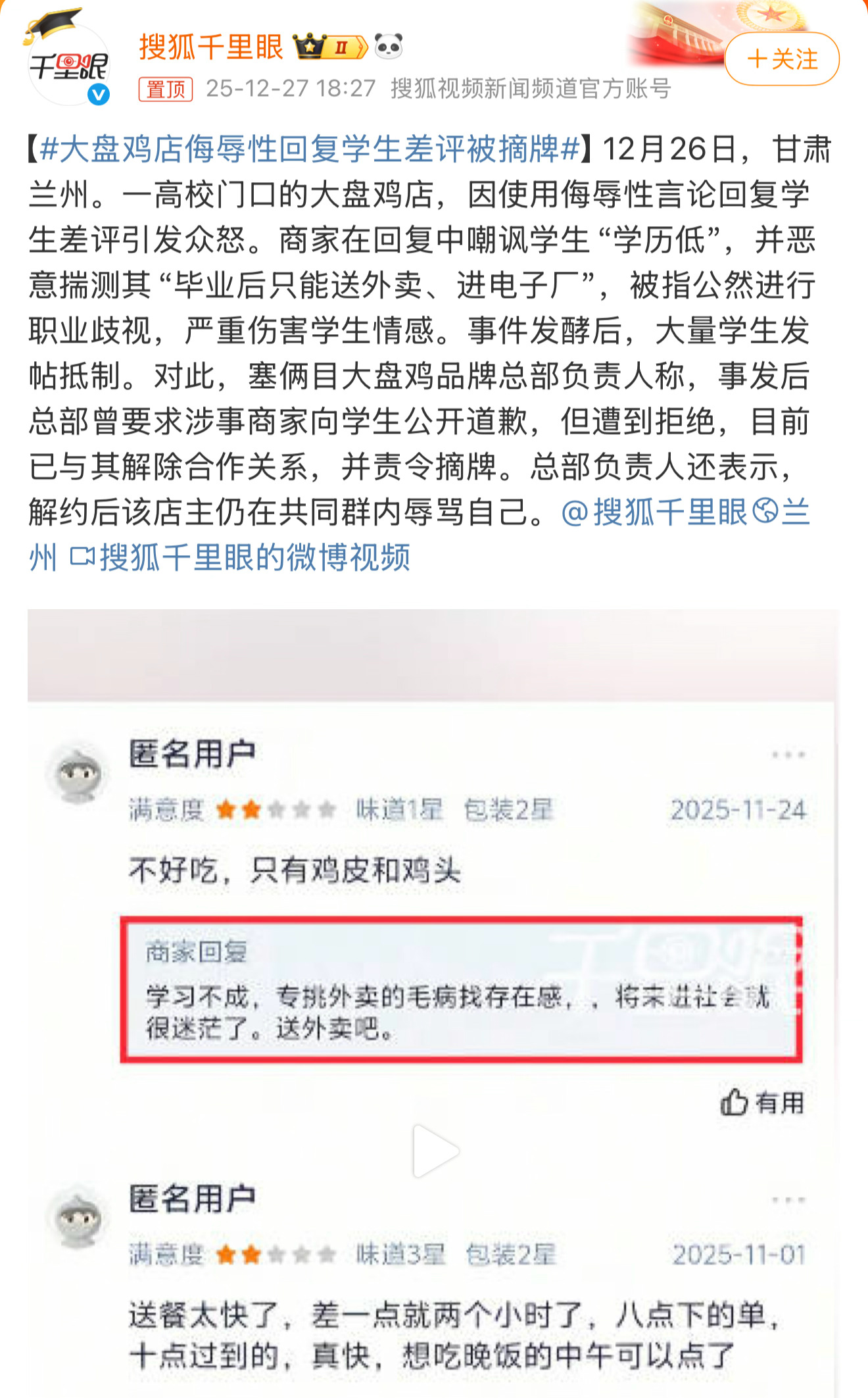 大盘鸡店侮辱性回复学生差评被摘牌塞俩目大盘鸡品牌总部负责人称,事发后总部曾要求涉事商家向学生公开道歉,但遭到拒绝,目前已与其解除合作关系,并责令摘牌。总部负责人还表示,解约后该店主仍在共同群内辱骂自己。
