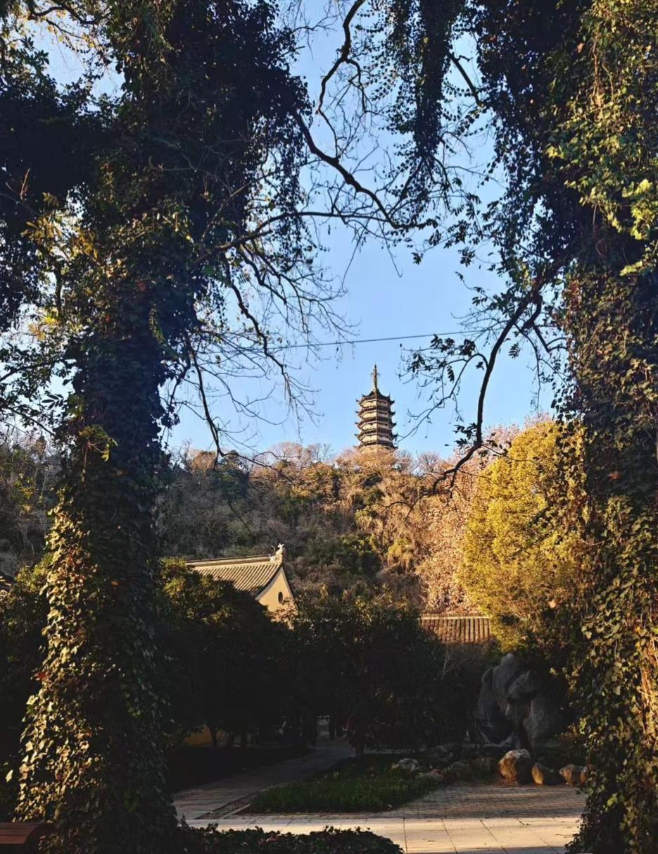 🌿古藤把蓝天缠成画框,宝塔在山巅接住晴光,连风过枝叶的轻响,都像岁月与古意碰了杯。 ✨树影织就的窗格里,古塔蘸着蓝天写光阴的诗,阳光漫过檐角时,尘世都浸着禅意的暖。 🍂藤蔓与枝桠搭起时光的门,远山的塔在晴日里站成永恒的注脚,每片叶的颤动,都是天地对谈的余韵。