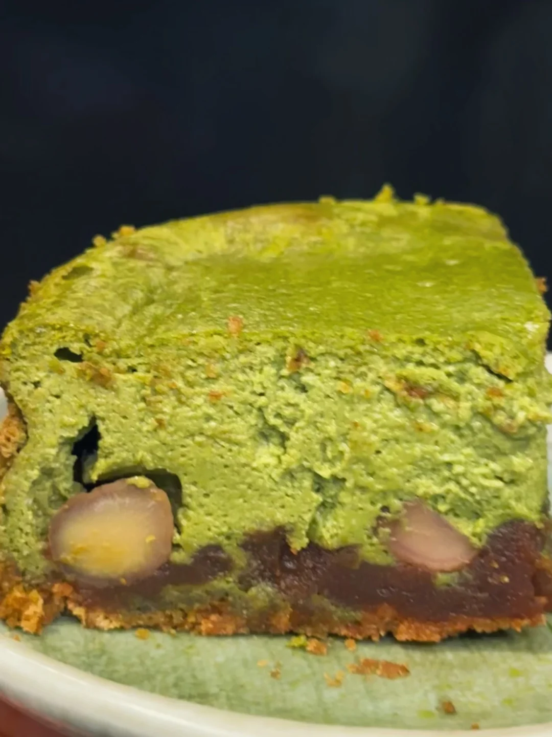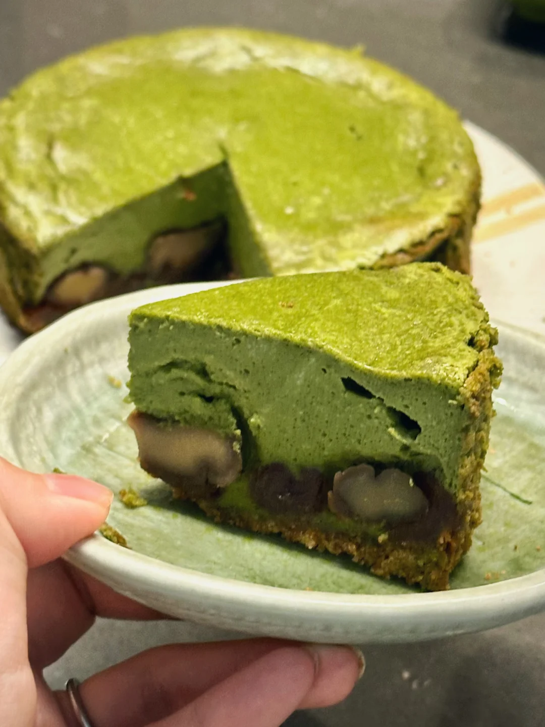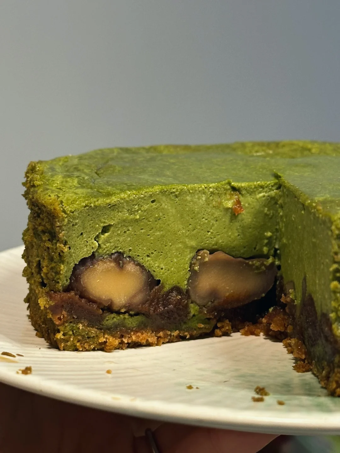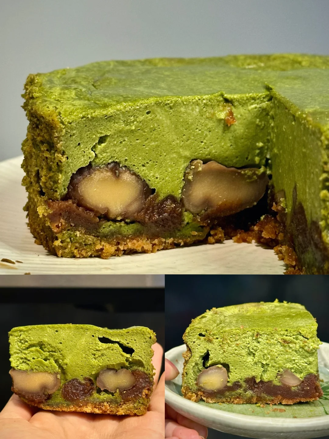 我这个版本与其说复刻不如说致敬,用了烤抹茶芝士蛋糕体和完整板栗仁,突出抹茶幽深清香和栗子熨贴质地的结合。还加了一层曲奇饼底和红豆沙,切面真的很让人欢喜,层次也丰富有趣。