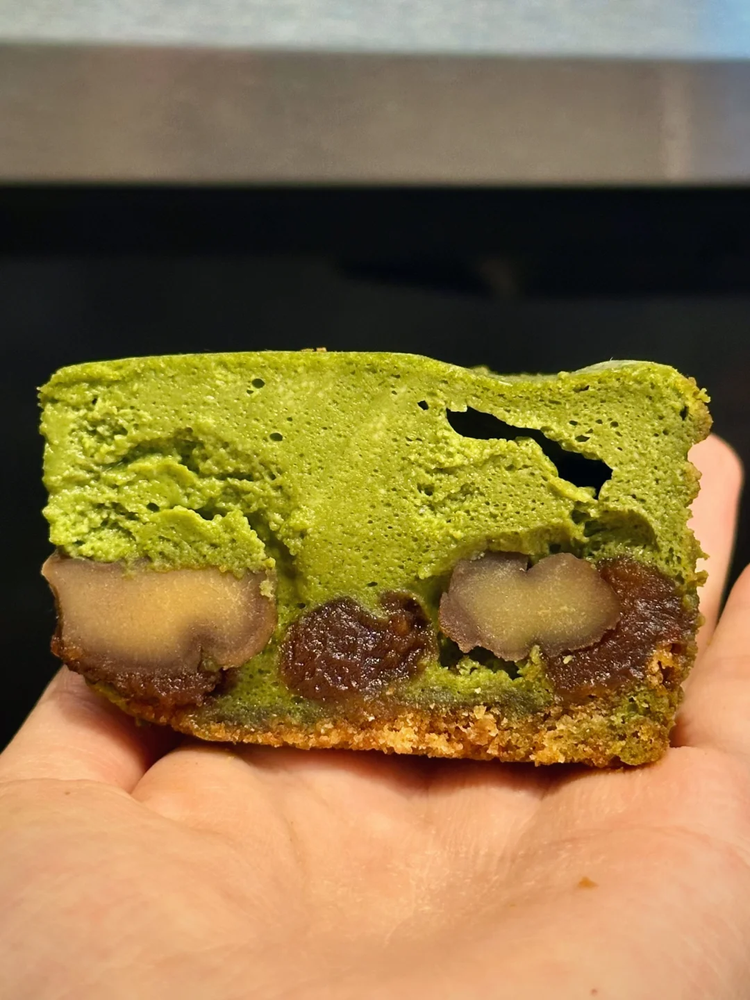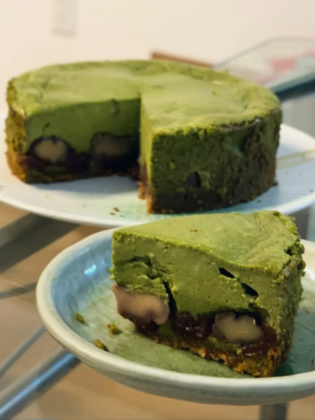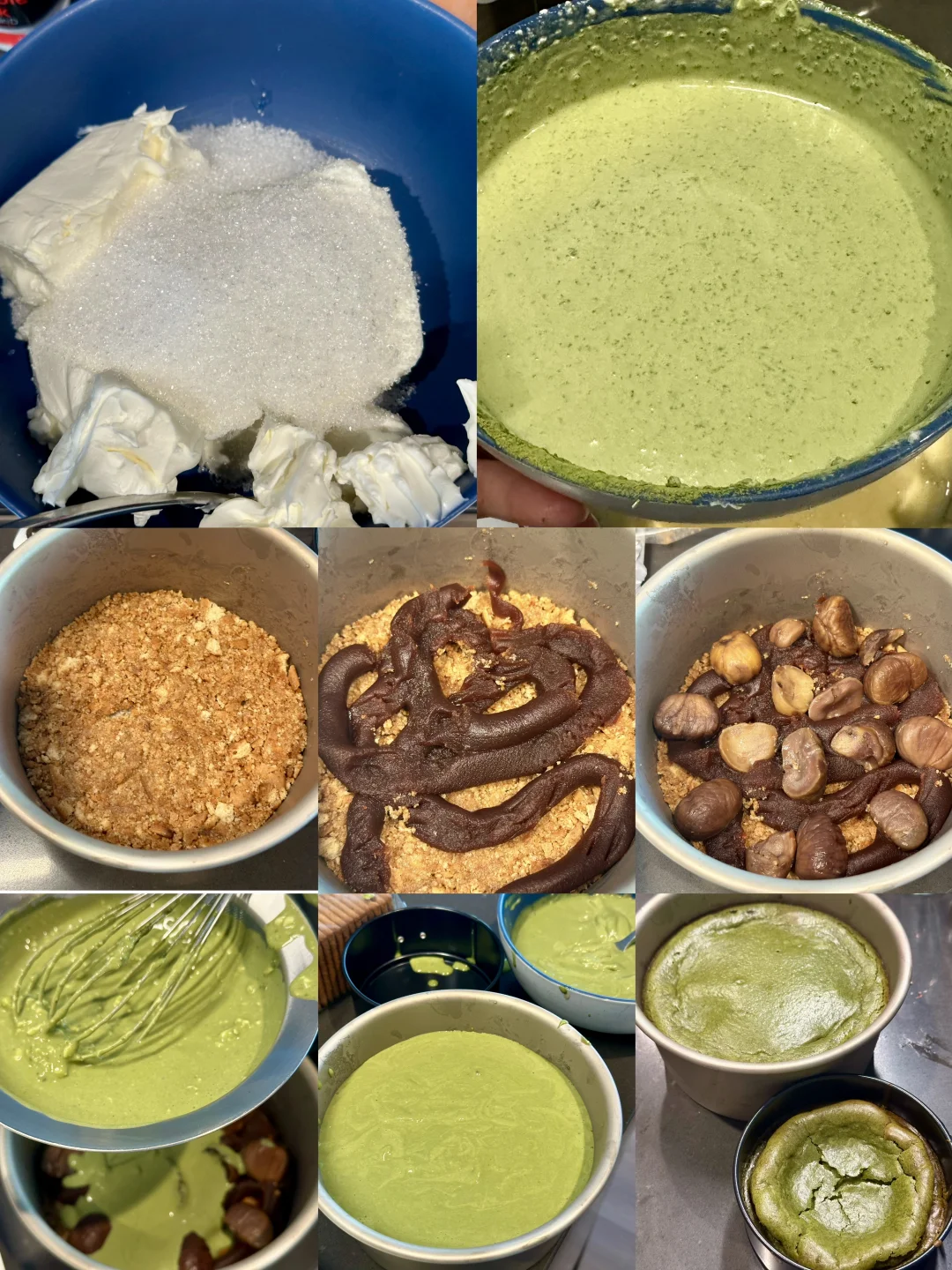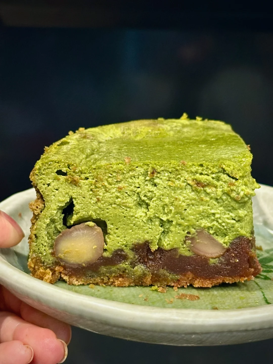 我这个版本与其说复刻不如说致敬,用了烤抹茶芝士蛋糕体和完整板栗仁,突出抹茶幽深清香和栗子熨贴质地的结合。还加了一层曲奇饼底和红豆沙,切面真的很让人欢喜,层次也丰富有趣。