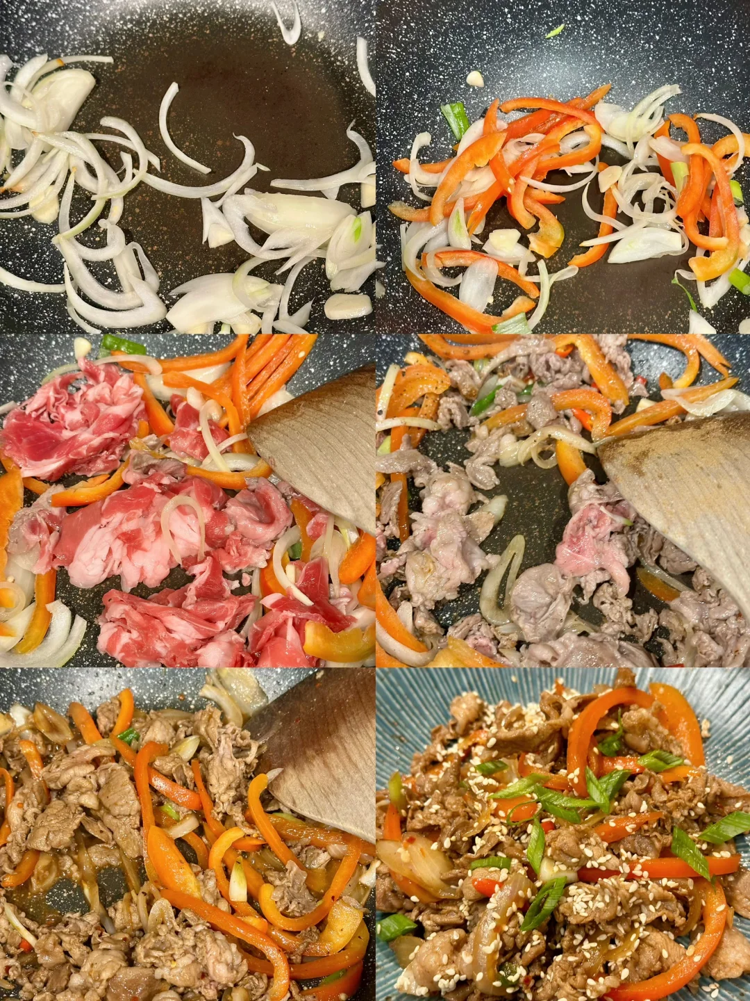 羊肉片,油,洋葱,蒜片,小米辣,彩椒,孜然粉,生抽,米酒,盐,白糖,白芝麻