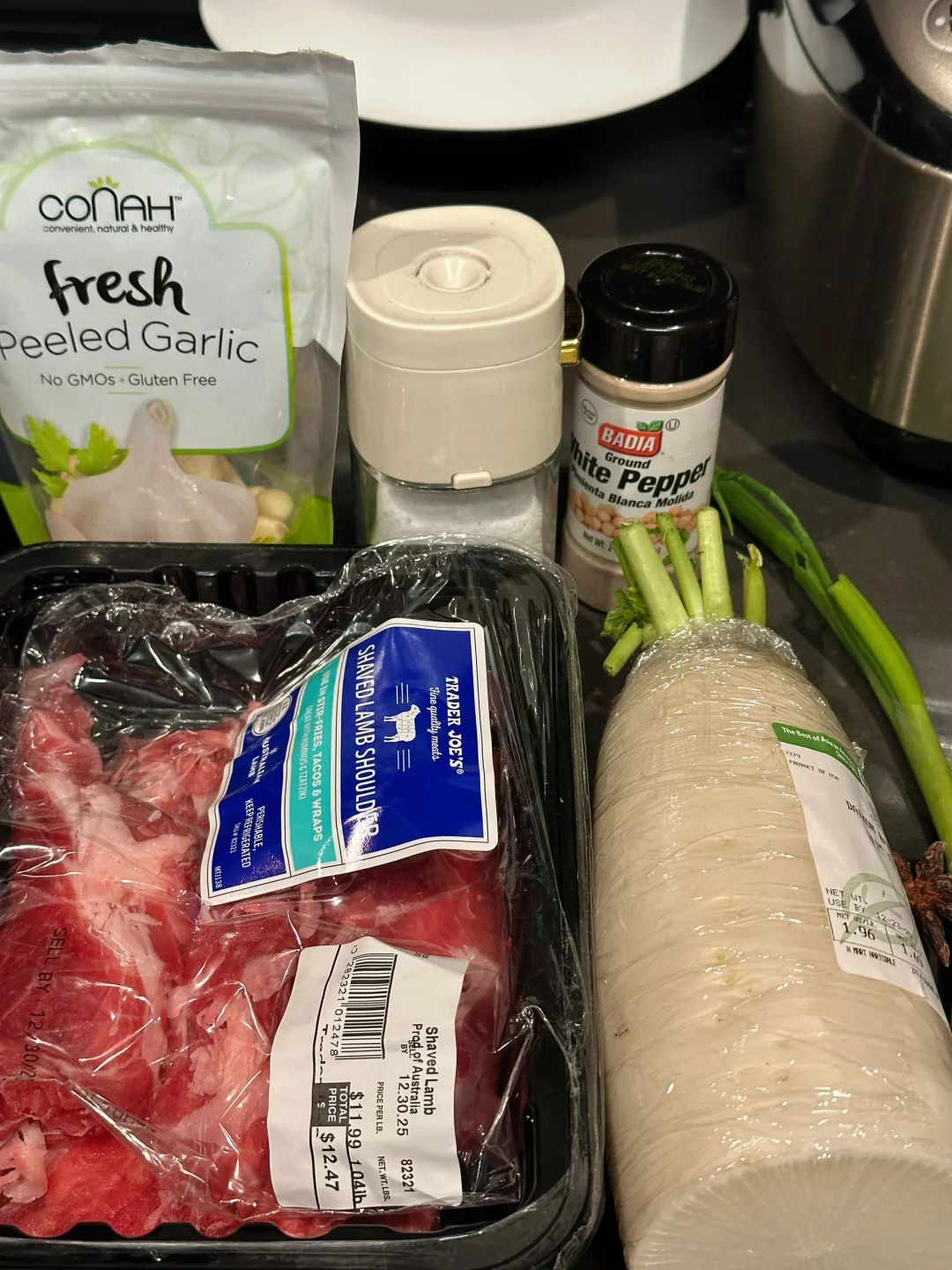 羊肉片,萝卜,葱段,蒜片,白胡椒粉,盐、辣椒油(可选)