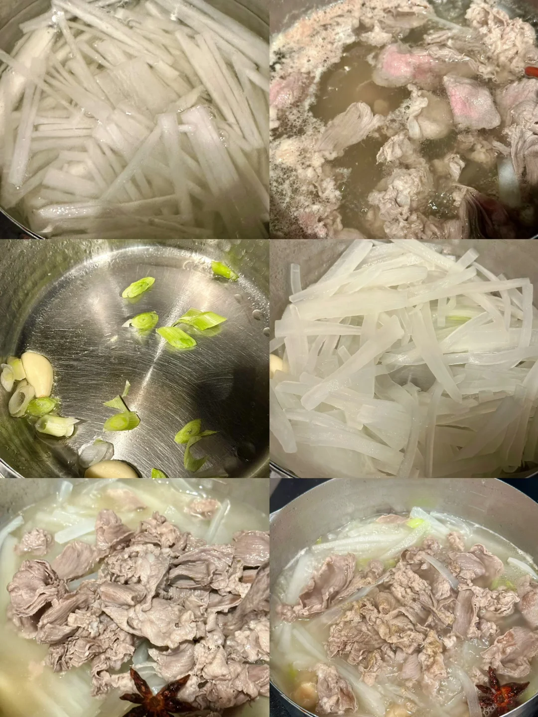 萝卜切丝焯水后沥干,同一锅水也把羊肉烫断生;