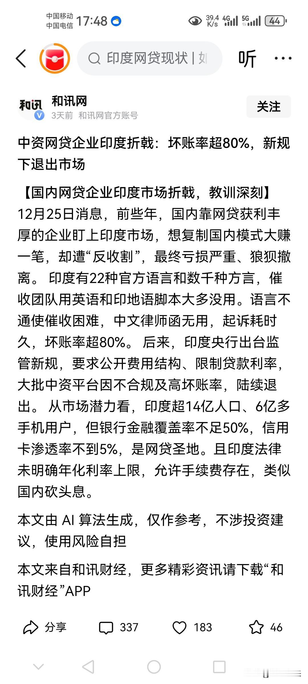 对付网贷还的是印度! 印度国人对待网贷那是来者不拒!多多益善,反正也不还,你奈我何! 中国国内的网贷赚的盆满钵满,野心膨胀要去印度大展宏图,结果呢折戟而归,坏账率达到80%,本金都快折了! 印度央行新规一出,很多网贷不合规,这下印度国民高兴不已,本来没想还,现在有国家撑腰了! 外国资本在印度那是血亏,印度国民把网贷当国补,特别是外国的网贷,基本上都退出了印度市场! 就这点我挺佩服印度的,不要白不要,白嫖是印度的强项!网贷 网贷债务