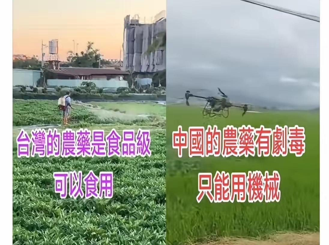 这是台蛙发在平台上的照片, 我第一次知道农药还有食品级的,也许台湾太先进了吧, 我没去过台湾,不知道台湾的农民,怎么喷洒农药,是不是把饭菜做熟了,上面喷点农药啊, 反正是食品级的,又没毒, 而且从图片看,一边用无人机,一边靠人工,明明是先进和落后的区别啊。