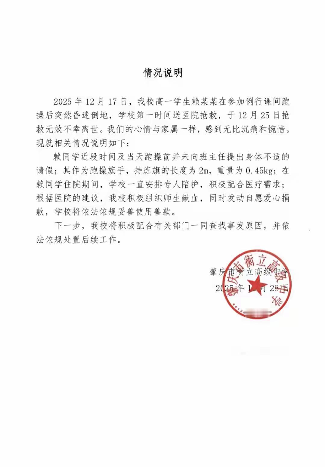 广东肇庆一中学回应高一学生课间跑操后离世据了解,该高一学生在课间跑操时突然身体不适倒下,随后校方紧急采取了一系列救助措施。学校第一时间拨打了120急救电话,同时校医也迅速赶到现场对学生进行初步急救。 事件发生后,学校领导高度重视,立即成立了专项工作小组,配合相关部门进行调查。目前,具体的死因还在等待专业机构的鉴定结果。 学校方面也发布声明,表示会积极配合家属做好后续的处理工作,并对学生的离世表示沉痛哀悼。对于学生家长,学校给予了充分的关心和安抚,安排专人与家属沟通,及时通报调查进展情况。 此事在社会上引起了广泛关注,不少网友都表达了对该学生的惋惜之情,同时也对学生的身体状况、跑操强度等方面提出了疑问。学校回应称,平时的跑操活动是按照正常的教学安排进行的,强度也是符合学生身体承受范围的。 相信随着调查的深入,事件的真相会逐渐浮出水面,学校也会给社会和家长一个公正、透明的交代。后续情况,我们也将持续关注。