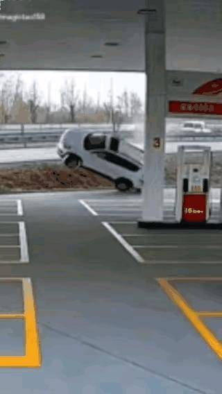 这画面可能是真的吗?如果是真实发生的事情,简直是太不可思议了,从公路上跌跌撞撞、连滚带爬的飞过来,最后居然落在了加油站,而且也精准的落在了加油机旁边,加油员,如果没有看到前因后果的话,还以为这台车是从天而降!