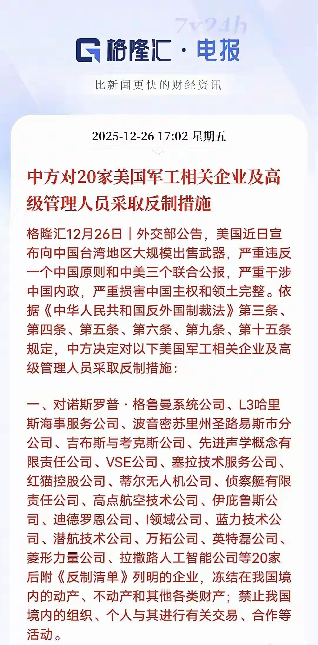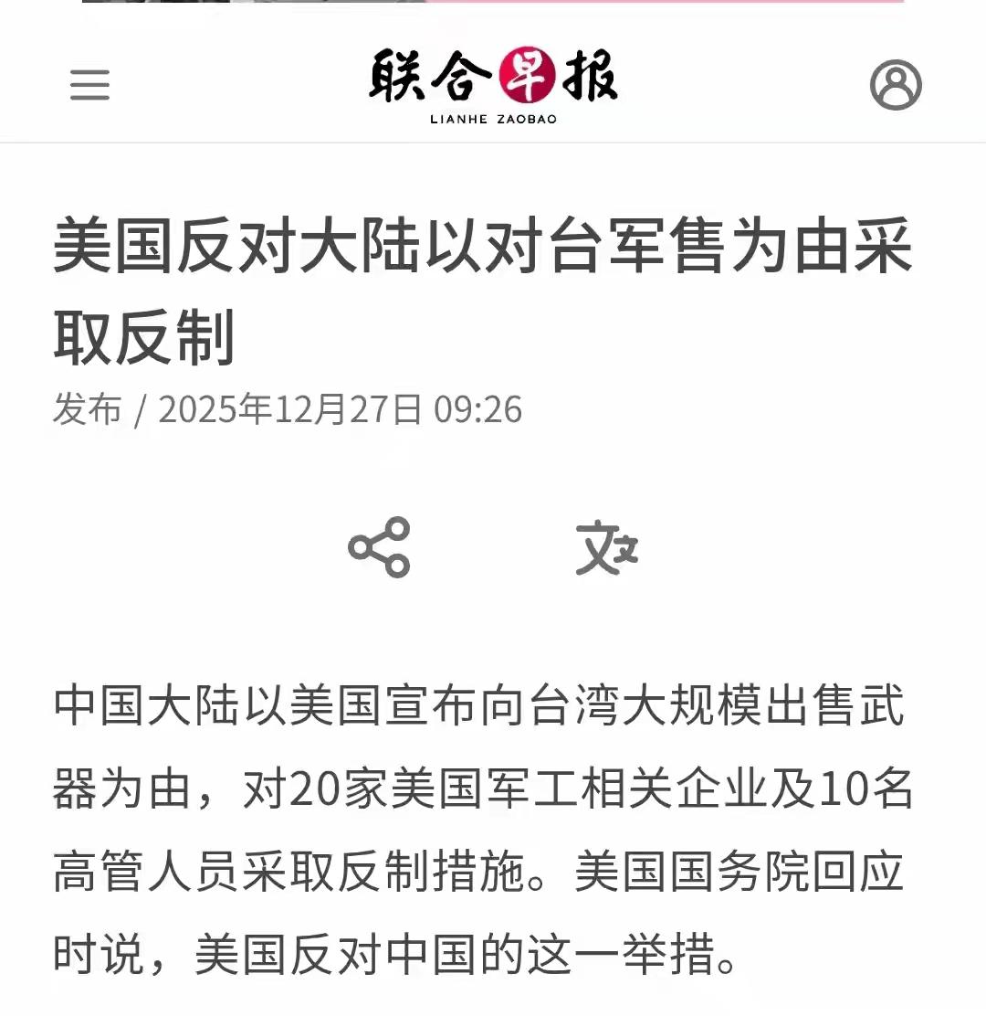 据中国对美国相关军工企业大概有20家企业进行了制裁,而美国却不乐意了,反对中国大陆对台军售还有采取的反制措施! 我觉得这一次中国的反制措施把美国给打疼了,美国也知道自己会被打疼的一天。美国何曾想过对台军事,对中国会产生什么样的影响?所以我坚决支持国家对美国军工企业进行大量的制裁! 美国能够看得懂,能够感受到疼痛的办法,才能让美国清醒!