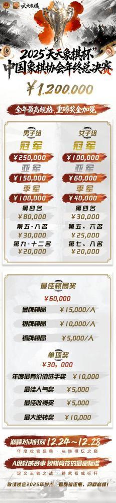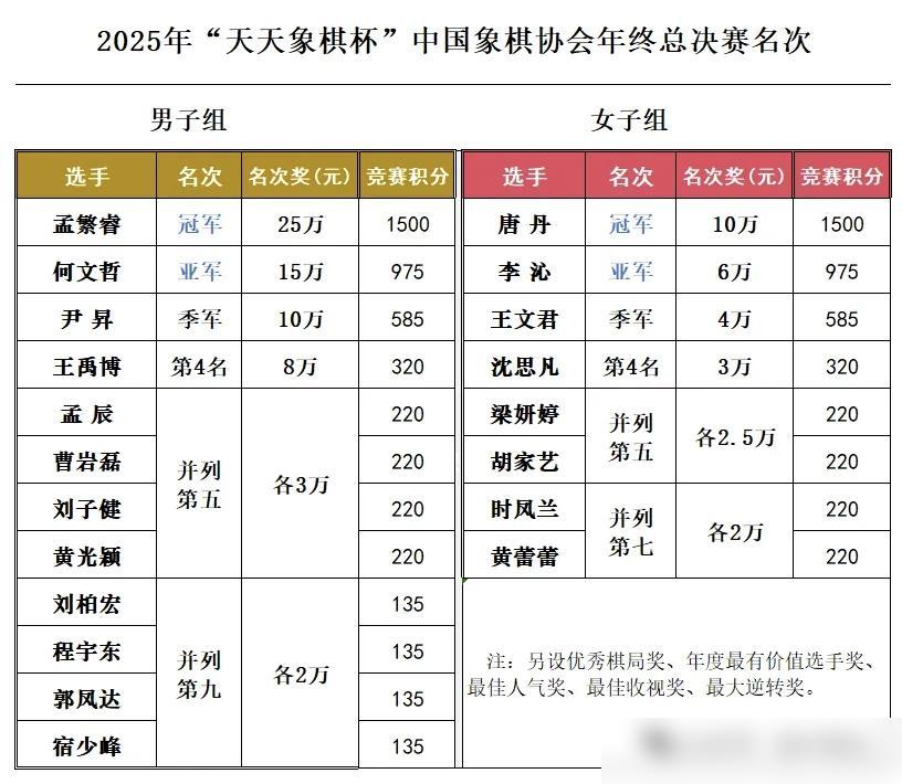孟繁睿勇夺桂冠。2025“天天象棋杯”中国象棋协会年终总决赛,今天下午男子组冠亚军决赛,孟繁睿对阵何文哲。 在这场备受瞩目的男子组巅峰对决中,孟繁睿最终顶住压力,在加赛环节击败何文哲,成功捧起了这个分量极重的冠军奖杯。 看完直播我最大的感受是,这种顶级比赛到了最后,拼的真不全是棋力,更多的是心脏够不够大。 本来慢棋环节双方下得四平八稳,谁也奈何不了谁,最后只能把悬念留给换先后的超快棋加赛。 说实话,超快棋那种读秒的压迫感太窒息了,哪怕是顶尖高手在时间见底时也难免犯错。 何文哲当时就是因为时间太紧,压根没留意到自己的黑马已经成了瓮中之鳖,最后因为没能在规定时间内走出应对,直接超时判负了。 这种输法确实挺令人遗憾的,毕竟在这么大的舞台上,因为几秒钟的迟疑就错失良机,心态上肯定是个考验。 但不得不说,孟繁睿确实稳准狠,这25万的冠军奖金拿得名副其实。 虽然何文哲作为亚军也有15万进账,但那一瞬之间的决策差距,让这10万块钱的奖金差显得格外残酷。 现在的小将真是越来越厉害了,在这种高强度的年终大考里能稳成这样,未来的象棋圈估计是他们的天下了。