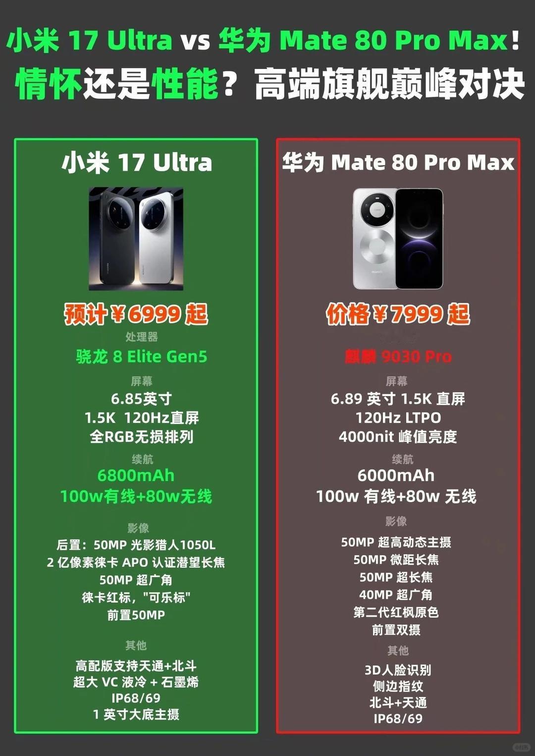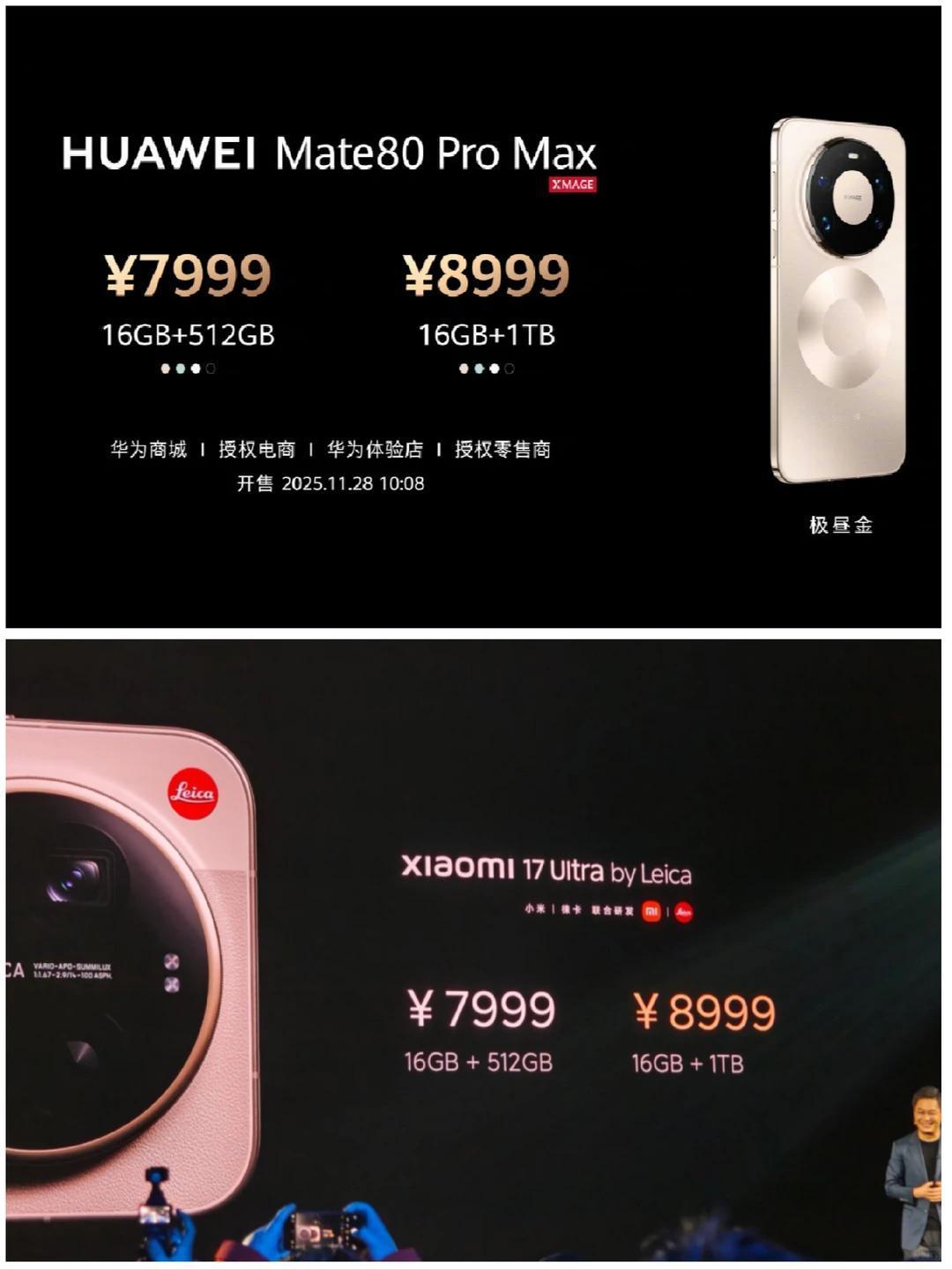 有点意思,小米17Ultra徕卡版也是7999起,跟华为Mate80ProMax又又又“撞车”了! 本来小米的顶级旗舰小米17Ultra是6999起,但无奈这次徕卡版用上了可乐标,机身设计镜头模组等部分等跟标准版不一样,论情绪价值,还是徕卡版给得足。 而同样把情绪价值给得足足的,那必然是华为Mate80ProMax,今年的80ProMax并不是Pro的加强版,更像是Mate80RS的标准版(不带RS设计的版本)。 这一上一下的调整后,小米17Ultra徕卡版跟华为Mate80ProMax价格居然一致,再考虑到OV两家的超大杯得晚一点,所以这两款手机好巧不巧的就成了对手。 实在没想通,小米在7999这个档位居然能威胁到华为,那么这两款手机大家会怎么选呢? 华为Mate80ProMax有双层OLED,有麒麟9030Pro+鸿蒙6系统,影像部分则是5000万像素1/1.28英寸超大底超高动态主摄+双长焦(50Mp微距长焦和50Mp超长焦),还有红枫影像加持,并且还有3D人脸; 小米17Ultra徕卡版屏幕上也有全RGB,芯片自然是骁龙8Elite Gen5,大师变焦环的设计更有可玩性,一英寸大底主摄+2亿可变长焦,再加上徕卡版本独享了徕卡主题和两款徕卡相机的模式,可玩性还是挺多。 并且,两款手机都是16+512G 7999,16+1T 8999。所以大家会怎么选呢?