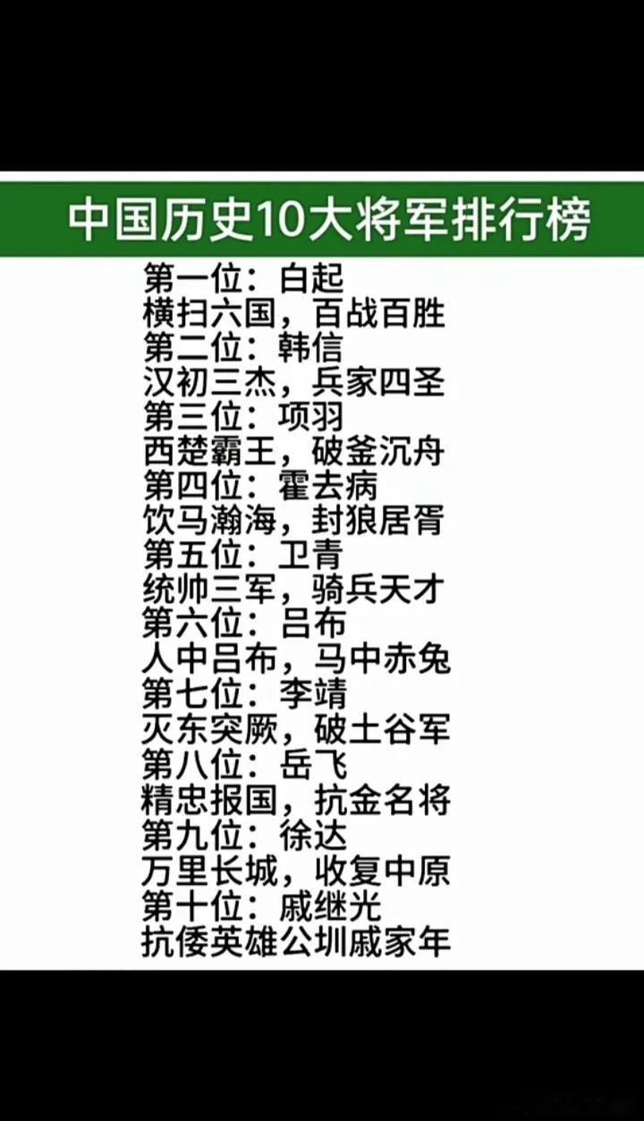 中国古代10大名将1、战国白起:横扫六国,百战百胜。2、秦末韩信:汉初三杰,兵家四圣。3、秦末项羽:西楚霸王,破釜沉舟。4、西汉霍去病:饮马瀚海,封狼居胥。5、西汉卫青:统帅三军,骑兵天才。6、东汉吕布:人中吕布,马中赤兔。7、唐朝李靖:灾东突厥,破土谷军。8、宋朝岳飞:精忠报国,抗金名将。9、明朝徐达:万里长城,收复中原。10、明朝戚继光:抗倭英雄,戚家军威名。