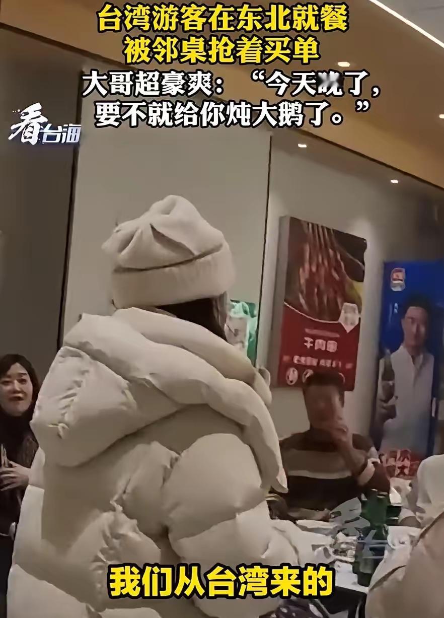格局打开了!说出来你可能不信,有人吃饭吃着吃着,单就被人偷偷结了。一饭馆里,两个台湾来的女生吃完喊买单,老板摆摆手说:“不用结啦,那边桌帮你们给了。”俩人当时就懵了,还以为听错了。 扭头一看,隔壁桌三四位东北大哥大姐正乐呵呵碰杯呢,完全看不出来刚刚给她们买过单的样子。 女生赶紧过去道谢,其中一个大哥特自然地说:“听口音就知道是台湾来的,到这了就好好玩!”旁边大姐也插话:“就是,多大点事儿,别客气。” 最逗的是,那位大哥还说:“这要是中午碰着,非拉你们回家炖大鹅不可!两岸一家亲嘛,回来了就是回家。” 后来女生说,她们坐回去的时候,那桌人已经又在聊家常了,好像啥都没发生过。 这种做了好事跟没事人一样心态,反而让她们心里特别暖。 我觉得吧,这种善意最珍贵的就是“不刻意”。 不是要你谢,也不是为了听句好话,就是顺手把事做了。 你们遇到过这种默默对你好的陌生人吗?